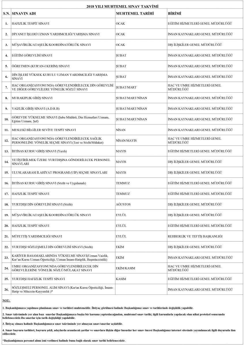 Başkanlığımızca 2018 yılı içerisinde yapılması planlanan "2018 Yılı Muhtemel Sınav Takvimi" yayınlanmış bulunmaktadır.Gerek Başkanlık personeli ve gerekse açıktan atama yoluyla Başkanlığımızda görev almak isteyenlerin merakla beklediği sınav takviminde lüzum görüldüğü durumlarda ve zaruri nedenlerden dolayı Başkanlıkça önceden değişiklik yapılabilecektir.İhtiyaç olması halinde Başkanlığımızca sınav takviminde yer almayan sınav/sınavlarda açılabilecektir.Açılacak sınavlarla ilgili hususlar (sınav başvuru tarihleri, başvuru şekli, adaylarda aranacak şartlar ve sınavlara ilişkin diğer bilgiler) Başkanlığımız internet sitesinde yayımlanacak duyurularda ilan edilecektir.
