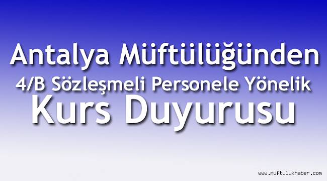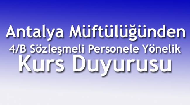 ANTALYA İL MÜFTÜLÜĞÜNDEN;Başkanlığımız tarafından taşra teşkilatındaki sözleşmeli pozisyonlarına; 2016 yılı KPSS puanına göre 4-B sözleşmeli İmam Hatip, Müezzin Kayyım, Kur'an Kursu Öğreticisi alınacaktır. 4/B Sözleşmeliİmam Hatip, Müezzin Kayyım, Kur’an Kursu Öğreticisi alımına müracaat eden adaylara yönelik Müftülüğümüz tarafından sınav öncesi sınava hazırlık için Kur'an-ı Kerim kursu düzenlenecektir.I- BAŞVURU ŞARTLARI1. 31/12/2017–16/01/2018 tarihlerinde (https://dibbys.diyanet.gov.tr/IKYS/Sinav/KurumDisi/) adresi üzerinden sınav başvuru programı aracılığı ile (SÖZPER-2017-II) 4-B Sözleşmeli İmam Hatip, Müezzin Kayyım, Kur'an Kursu Öğreticisi Kur’an Kursu Öğreticiliğine başvuru yapmış olmak.II- BAŞVURU ŞEKLİ, YERİ VE ZAMANI31/12/2017–16/01/2018 tarihlerinde (https://dibbys.diyanet.gov.tr/IKYS/Sinav/KurumDisi/) adresi üzerinden başvuru yapan adayların müracaat başvuru formu ile birlikte Antalya İl Müftülüğü Din Hizmetleri ve Eğitimi Şube Müdürlüğüne 09.01.2017 - 12.01.2017 tarihine kadar mesai saatleri içerisinde başvuru yapacaklardır. Başvurular bu duyuruda belirlenen esaslara uygun olmayan, posta ve faks yolu ile yapılan başvurular ile duyuruda belirtilen tarihlerden sonra yapılan başvurular kabul edilmeyecektir.III- BAŞVURU İÇİN GEREKLİ BELGELERBaşvuru müracaat formu. ( Başvuru onaylandıktan sonra alınan form) Dilekçe. ( Müftülüğümüzden alınacaktır.)Not: Kurs ile ilgili bilgiler daha sonra Müftülüğümüz tarafından ilan edilecektir.Osman ARTANİl Müftüsü