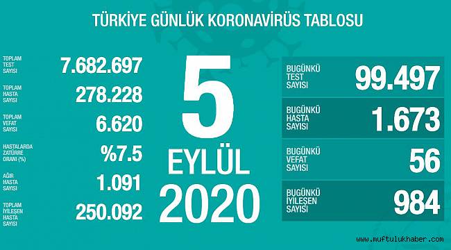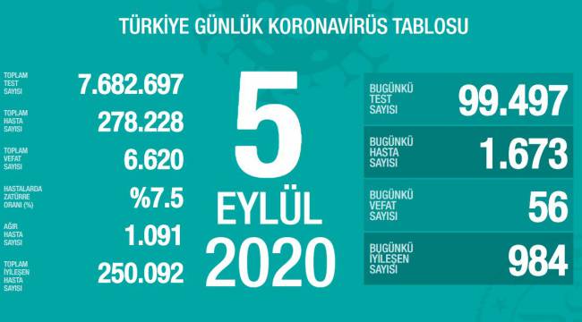 Sağlık Bakanlığının Covid-19 bilgilendirme sayfasında Türkiye'nin güncel korona virüs tablosu kamuoyuyla paylaşıldı. Tabloya göre son 24 saatte 56 kişi korona virüsten hayatını kaybetti, toplam can kaybı 6 bin 620'ye yükseldi. Bugün toplam 99 bin 497 test yapılırken, bin 673 yeni vaka tanısı konuldu.Toplam vaka sayısı ise 278 bin 228 oldu. Bugün iyileşen 984 kişiyle birlikte toplam iyileşen hasta sayısı 250 bin 92'ye yükseldi. Toplam hastalarda zatürre oranının yüzde 7.5, toplam ağır hasta sayısının ise bin 91 olduğu açıklandı.Sağlık Bakanı Fahrettin Koca, sosyal paylaşım sitesi Twitter hesabından yaptığı paylaşımda, “Sevdiklerimizi korumak için tedbirlere uymak zorundayız. Bu zorunluluk her birimiz için kimsenin bizi zorlamadan uymamız gereken bir ödevdir. Ancak birlikte mücadele ederek virüsü yenebiliriz. Gücümüz birlikte tedbirlere uymakta” ifadelerine yer verdi.