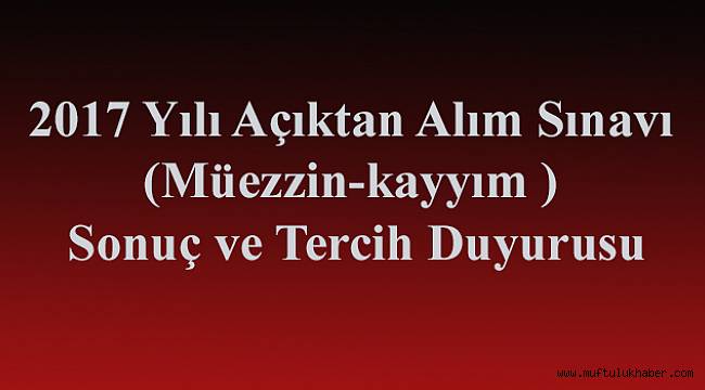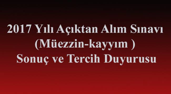 https://dibbys.diyanet.gov.tr/IKYS/Sinav/KurumDisi/ adresi üzerinden öğrenebileceklerdir. Sözlü sınav sonucuna göre belirlenen kontenjanlara göre tercih yapmaya hak kazanan adaylar tercih işlemlerini 30.01.2018 ile 05.02.2018 tarihi saat 23:55’e kadar Başkanlığımız DİBBYS programındaki https://dibbys.diyanet.gov.tr/sinav/kurumdisi adresi üzerinden yapacaklardır. Adaylar yerleştirme sonuçlarını https://dibbys.diyanet.gov.tr/sinav/kurumdisi adresi üzerinden 07.02.2018 tarihinde öğrenebileceklerdir. Tercihlere yerleştirme işlemleri sözlü sınav başarı puanı en yüksek olandan başlamak suretiyle Başkanlığımızca bilgisayar ortamında gerçekleştirilecektir. Puanların eşit olması durumunda KPSS puanı yüksek olana, onunda eşit olması halinde KPSS’ye katıldığı öğrenim belgesinin mezuniyet tarihi önce olana, bu süreninde eşitliğinde doğum tarihi önce olana öncelik verilecektir. Tercih yaptığı halde tercihlerine yerleşemeyen adaylar, ait olduğu kontenjan grubunda münhal kalan yerlere Başkanlıkça re'sen yerleştirilecektir. Tercih yapmayan adayların yerleştirme işlemi yapılmayacaktır. İlgililere duyurulur.2017 YILI AÇIKTAN ALIM SINAVI (MÜEZZİN-KAYYIM ) SINAVI