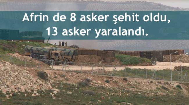 Türk Silahlı Kuvvetleri'nce (TSK) Afrin'deki terör örgütlerine yönelik sürdürülen 'Zeytin Dalı Harekatı'nda, güvenlik güçleriyle teröristler arasında çatışma çıktı. Çok sayıda teröristin etkisiz hale getirildiği çatışmada, 8 askerin şehitolduğu, 13 askerin ise yaralandığı bildirildi.ONLARCA TERÖRİST ETKİSİZ HALE GETİRİLDİHatay'ın Hassa ilçesinin karşı tarafına düşen afrin kırsalındaki Hac Bilal köyü Kel Tepe bölgesinde, saat 14.00 sıralarında, güvenlik güçleri ile PYD/YPG'li teröristler arasında çatışma çıktı. Ağır silahlarla saldırıda bulunan onlarca terörist, güvenlik güçlerince etkisiz hale getirildi.TÜNELLERDEN SALDIRDILARTerörist grubu etkisiz hale getiren güvenlik güçlerinin ele geçirmek için ilerlediği Kel Tepe bölgesinde bulunan tünellerden 80-100 kişilik terörist grubu çıktı. Tünellerden çıkan teröristler, ellerindeki ağır silahlarla PÖH, JÖH ve koruculardan oluşan timlere saldırmaya başladı.8 ASKER ŞEHİT OLDU, 13 ASKER YARALIGüvenlik güçlerinin anında karşılık vermesiyle başlayan ve 5 askerin şehit olduğu çatışmada 7 asker de yaralandı.HELİKOPTER İSABET ALDIÇatışma bilgisi üzerine bölgeye takviye birlikler sevk edilirken, teröristlerin bulunduğu Kel Tepe bölgesi sınırda konuşlu birlikler tarafından obüs ve çok namlulu roketatarlar ile ateş altına alındı.Bu sırada hava desteği ve yaralıların tahliyesi için havalanan ve bölgeye ulaşan ATAK helikopterler de teröristler tarafından saldırıya uğradı.Teröristlerin saldırısında bir helikopter isabet alınca iniş yapamayarak geri çekildi. Bunun üzerine havalanan jetler teröristlerin bulunduğu tepe bölgesine hava bombardımanı düzenledi. Uçakların bombalamasının ardından bölgeye inen helikopterler durumu ağır olan yaralıları tahliye ederek Hatay ve ilçelerindeki hastanelere taşıdı.Durumu daha iyi olan yaralılar ise araçlarla sınır hattına taşındı ve ambulanslarla hastanelere ulaştırıldı.