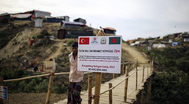 Myanmar’da Budist fanatikler ve ordunun saldırılarından kaçarak canlarını kurtarmak için Bangladeş’e gelen 620 binden fazla Arakanlı Müslüman, Bangladeş sınırındaki kamplarda zorlu şartlarda yaşamlarını sürdürmeye devam ediyor.Ağustos ayından bu yana bölgede yardım çalışmalarını aralıksız sürdüren Türkiye Diyanet Vakfı, insani yardımların yanı sıra bölge halkının yaşam koşullarının iyileştirmesi için de çalışmalar gerçekleştiriyor.Arakanlı Müslümanların evlerini oluşturmaları için bambu ve tente gibi malzemeler temin eden tdv ekipleri, banyo, su kuyuları, köprü ve cami inşa etti.Arakanlı Müslümanlara yönelik eğitim çalışmalarını ön planda tutan Vakıf, farklı ülkelerdeki Arakanlı öğrencilere verdiği eğitim desteğinin yanı sıra kamplarda hem dini hem de Bangladeş Eğitim Bakanlığı müfredatına göre derslerin verileceği bir medrese inşa ettiriyor.Türk bayrağı dalgalanıyorTepede Diyanet İşleri Başkanlığı ve TDV’nin bayraklarının yanı sıra bir de Türk bayrağı dalgalanıyor. Türk bayrağı, Kutupalong’daki kampların birçok yerinden görülebiliyor.Türkiye Diyanet Vakfı’nın yardım faaliyetilerini sürdürdüğü bölge içerisinde bulunan alan, kamplarda yaşayan Arakanlılar tarafından “Türkiye Tepesi” ya da “Türk Tepesi” diye ifade ediliyor.Birçok yerinde motorlu araçların geçebileceği yol bulunmayan on binlerce kişilik kampta yol tarifinde de kimi zaman Türk Tepesi kullanılıyor. Hatta bölgede yardım faaliyetleri yürüten birçok uluslararası kuruluş, kendi haritalarında bölgeyi “Turkish Hill” (Türk Tepesi) olarak işaretlemiş durumda.FSM, Osman Gazi ve Yavuz Sultan Selim köprüleriBölgede tepeler arasındaki dereleri geçmekte zorlanan Arakanlılar için TDV tarafından yaptırılan üç köprü bulunuyor.Bambudan yapılan köprülere verilen isimler de Türkiye’deki köprülerin adını taşıyor. Fatih Sultan Mehmet, Osman Gazi ve Yavuz Sultan Selim köprüleri, Arakanlı Müslümanların hayatlarını kolaylaştırıyor.Köprülerin girişlerinde bulunan tabelalarda yerel dilin yanı sıra Türkçe ve İngilizce “Bu köprü Türk halkının Bangladeş’te bulanan Arakanlı mültecilere hediyesidir” yazısı dikkati çekiyor.“Bize yardım eli uzatan Türkiye’yi çok seviyoruz”Türk Tepesi’ndeki Arakanlı Müslümanlar da Türkiye ve Türk halkına şükranlarını dile getiriyor.Birçok Arakanlı, Myanmar’dan gelmeden önce Türkiye’yi bilmediklerini ancak burada Türk yardım kuruluşları sayesinde Türkiye hakkında bilgi sahibi olduklarını belirtiyor.Arakanlı Müslümanlardan Sogira Hammad, 1,5 aydır kampta yaşadığını, Türk yardım kuruluşlarının ailesine gıda, barınak gibi malzemeler sağladığını söyledi. “Türk halkı sayesinde hayatta kaldık” diyen Sogira Hammad, daha önce Türkiye ya da Türk halkı hakkında hiçbir fikri olmadığını belirtti. Hammad, “Bize yardım eli uzatan Türkiye’yi çok seviyoruz” diye konuştu.Abdül Haşim adlı Arakanlı ise 2 ay önce Bangladeş’e geldiğini, ilk zamanlar su ve gıda dahil hiçbir şeyleri olmadığını dile getirdi. Haşim, şimdi Türk yardım kuruluşlarının yardımıyla hayatını sürdürdüğünü dile getirerek, “Yardımsever Türk halkının katkılarıyla yaşıyoruz” dedi.Anmar Begüm de 2 aydır burada olduğunu söyledi ve “Türk Tepesi’nde olmaktan çok memnunum. Türk kuruluşlarının yardımlarıyla hayatımızı sürdürüyoruz. Elhamdülillah Türk halkı çok yardımsever. Bize yardım eli uzattılar. Bunun için şükran duyuyoruz” ifadesini kullandı.