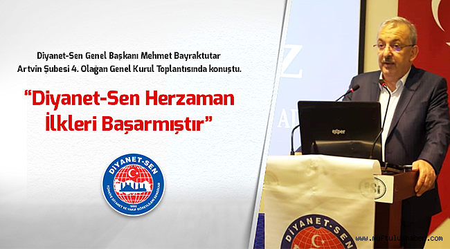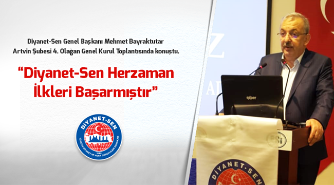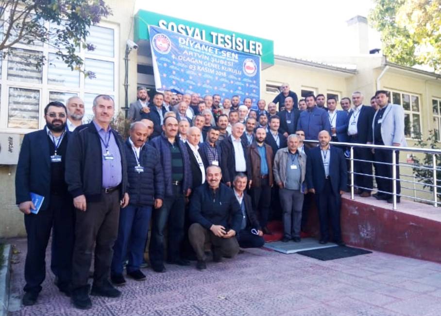 Diyanet-Sen Artvin Şubesi 4. Olağan Genel Kurul Toplantısı gerçekleştirildi.Toplantıya Diyanet-Sen Genel Başkanı Mehmet Bayraktutar, Artvin Belediye Başkanı Mehmet Kocatepe, İl Başkanı Şenol Alparslan, Memur-Sen İl Başkanı İbrahim İnce, Kadın Kolları Başkanı Gülser Güray, Rize Şube Başkanı Recep Şafak ve yönetimi, Artvin şubesi kurucu ve Onursal Başkanı Belediye Kültür Turizm Müdürü Hamdi Özder, Memur-Sen ve bağlı sendikaların başkan ve yönetim kurulu üyeleri, çok sayıda STK temsilcisi, bürokratlar davetliler ve delegeler katıldı.Genel Kurul toplantısında katılımcılara hitap eden Bayraktutar Diyanet-Sen’in ülkemizin her il ve ilçesinde teşkilatlanmış büyük bir aile olduğunu belirterek “İşte bu teşkilat sendikacılık tarihinde hep ilkleri başarmıştır. İlk din görevlileri sendikası olma payesiyle başlayan kuruluşumuz bu gün 15. yetki yılında yüzde 68’lik sendikalaşma oranı ile kamu görevlileri sendikaları arasında yakalanması zor bir orana ulaşmıştır. Bu yıl ayrıca 81 ilin 81’inde de yetkiyi alarak bir ilke daha imza attık. Türkiye genelinde ve 81 ilde yetkiyi alarak Türkiye sendikacılık tarihinde bir ilki daha başarmış olduk. Bu büyük bir başarı, bu büyük bir onurdur. Bu başarının, onurun mimari da sizlersiniz, büyük Diyanet-Sen ailesidir.” Dedi.
