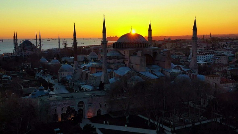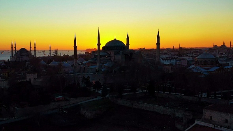 Drone ile çekilen görüntülerde gün batımıyla kızıla bürünen gökyüzü Ayasofya'ya manzarasına eşsiz güzellik katıyor.