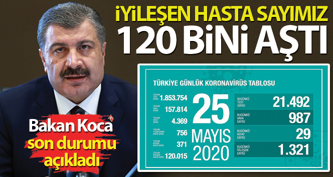 Sağlık Bakanlığı, korona virüse ilişkin 25 Mayıs verilerini açıkladı. Açıklamaya göre, son 24 saatte 29 kişi korona virüsten hayatını kaybetti, toplam can kaybı ise 4 bin 369 oldu. Bugün toplam 21 bin 492 test yapılırken, 987 yeni vaka tanısı kondu.