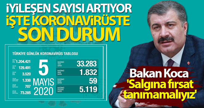 Sağlık Bakanlığı, korona virüse ilişkin 5 Mayıs 2020 tarihli son verileri açıkladı. Son 24 saatte korona virüs nedeniyle 59 kişinin hayatını kaybettiğini, toplam can kaybının ise 3 bin 520‘e yükseldiğini bildirdi. Açıklamaya göre bugün 33 bin 283 test yapılırken, bin 832 yeni vaka tespit edildi.