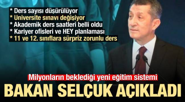 Milli eğitim Bakanı ziya Selçuk, yeni eğitim sisteminin ayrıntılarını açıkladı. Bakan Selçuk, "9'larda 15-16 dersten söz ederken, şu anki tasarımda 8 dersten söz ediyoruz. 10. sınıfta 9 ders, 11'inci sınıfta 9'a ve 12'inci sınıfta 7'ye düşecek. Niye azaltıyoruz? Bir çocuğun 15-16 dersi anlaması ve içselleştirmesi mümkün olmuyor" dedi. Bakan selçuk 2024'te üniversite sınavının değişeceğini de söyledi.