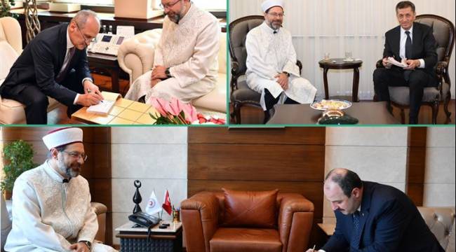 Diyanet İşleri Başkanı Prof. Dr. Ali Erbaş, Sanayi ve Teknoloji Bakanı Mustafa Varank, Ulaştırma ve Altyapı Bakanı Cahit Turhan ile Milli Eğitim Bakanı Ziya Selçuk’a makamlarında tebrik ve hayırlı olsun ziyaretinde bulundu.Ziyaretlerde, Bakan Varank, Turhan ve Selçuk Türkiye diyanet Vakfı’na kurban bağışı yaptı.