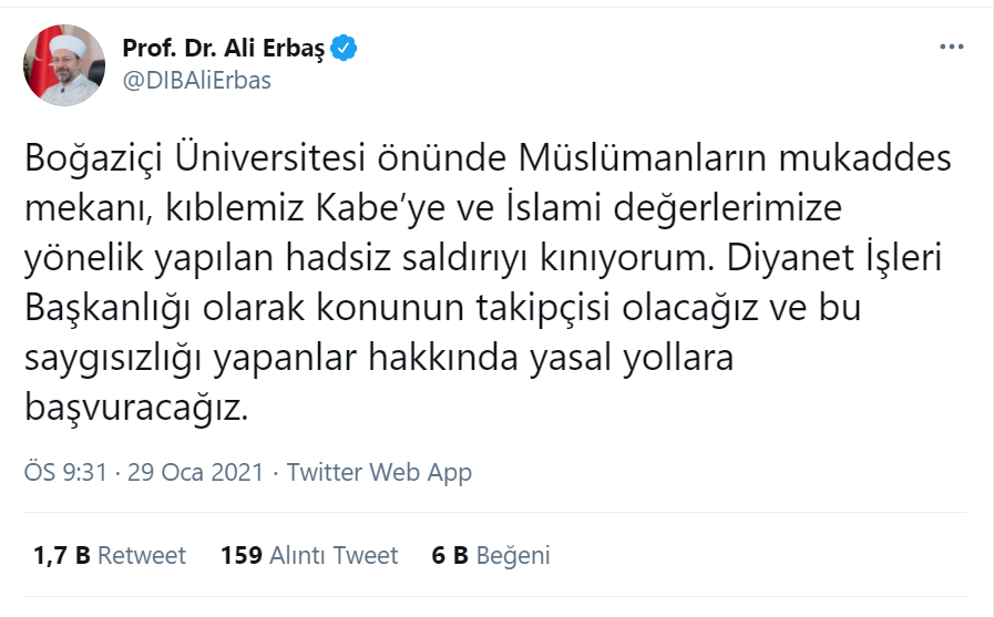 Diyanet İşleri Başkanı Prof. Dr. Ali Erbaş, Boğaziçi Üniversitesi önünde açılan bir resim sergisinde Kabe fotoğrafının yere serilmesi olayına kişisel sosyal medya hesaplarından yayınladığı mesajla tepki gösterdi.Başkan Erbaş mesajında şu ifadelere yer verdi:
