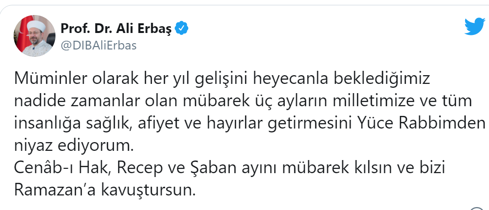 Diyanet İşleri Başkanı Prof. Dr. Ali Erbaş, yarın başlayacak recep, şaban ve ramazan aylarını kapsayan üç aylar dolayısıyla bir mesaj paylaştı.Müslümanların, Rahmet, bereket ve mağfiret mevsimi üç ayları, heyecanla beklediğini ifade eden diyanet İşleri Başkanı Erbaş, üç ayların tüm insanlığa sağlık, afiyet ve hayırlar getirmesi niyazında bulundu.Başkan Erbaş’ı sosyal medya hesaplarından paylaştığı mesajı şu şekilde:“Müminler olarak her yıl gelişini heyecanla beklediğimiz nadide zamanlar olan mübarek üç ayların milletimize ve tüm insanlığa sağlık, afiyet ve hayırlar getirmesini Yüce Rabbimden niyaz ediyorum.Cenâb-ı Hak, Recep ve Şaban ayını mübarek kılsın ve bizi Ramazan’a kavuştursun.”