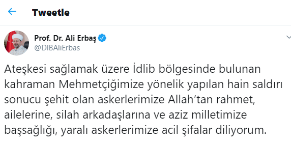 Milli Savunma Bakanlığı'nın İdlib'de 2 Mehemtçiğin şehit olması ve 5 askerin yaralandığını duyurmasının ardından Diyanet İşleri Başkanı Prof. Dr. Ali Erbaş, kişisel sosyal medya hesaplarından bir taziye mesajı yayınladı.Milli Savunma Bakanlığı, "İdlib bölgesindeki unsurlarımıza yapılan hava saldırısı sonucu 2 kahraman silah arkadaşımız şehit olmuş, 5 silah arkadaşımız da yaralanmıştır." açıklamasında bulunmuştu.