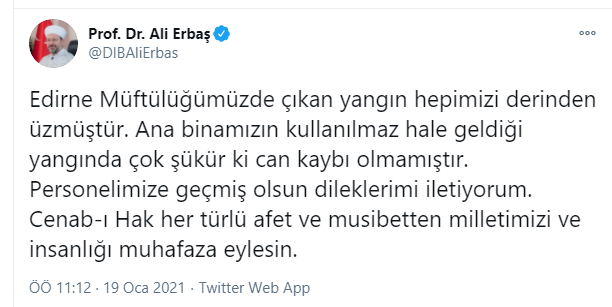 Diyanet İşleri Başkanı Prof.Dr.Ali ERBAŞ Edirne Müftülüğü Hizmet Binasında çıkan yangın dan dolayı geçmiş olsun mesajı yayınladı.