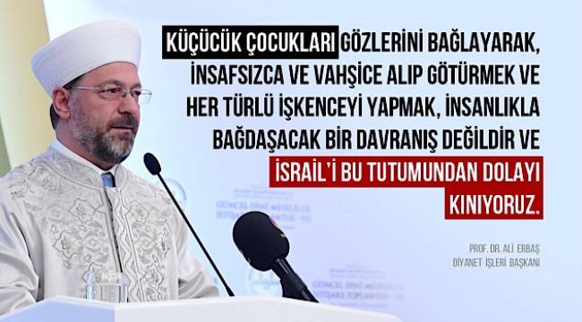 Diyanet İşleri Başkanı Prof.Dr.Ali Erbaş Twitter hesabında İsrail’i kınayan bir mesaj yayınladı.Başkan mesajın da ;Küçücük çocukları gözlerini bağlayarak, insafsızca ve vahşice alıp götürmek ve her türlü işkenceyi yapmak, insanlıkla bağdaşacak bir davranış değildir ve İsrail’i bu tutumundan dolayı kınıyoruz.dedi.