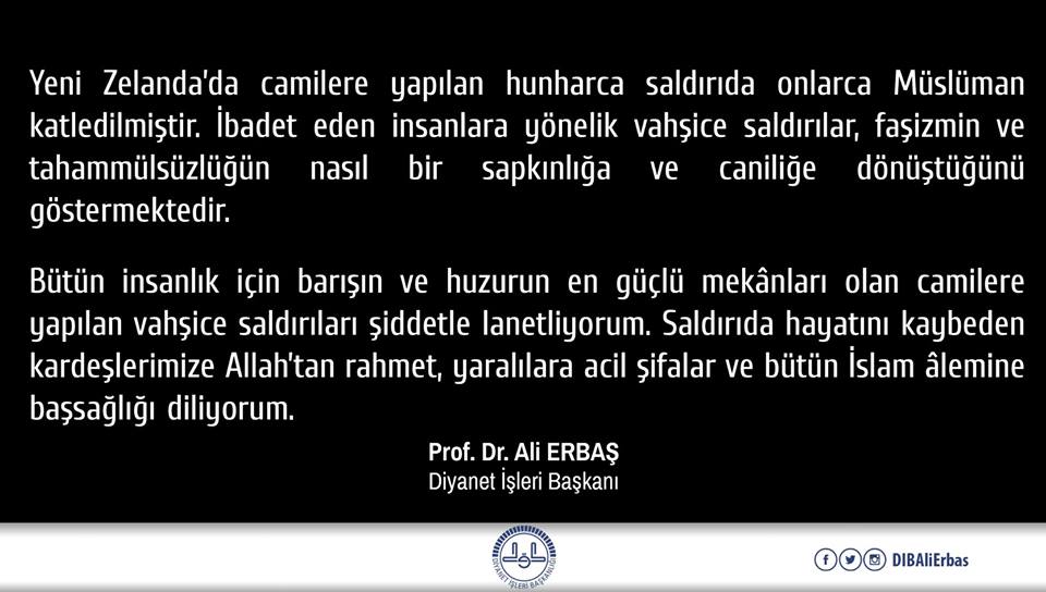 DİYANET Yayınlanma: 15 Mart 2019 - 11:14 Güncelleme: 15 Mart 2019 - 14:57 Başkan ERBAŞ dan Kınama Diyanet İşleri Başkanı Prof.Dr.Ali ERBAŞ Yeni Zelanda’da camilere yapılan hunharca saldırıyı kınayan bir mesaj yayınladı. DİYANET 15 Mart 2019 - 11:14 Güncelleme: 15 Mart 2019 - 14:57 Yorumlar 1 dk okunma süresi Dinle Yazdır A Büyüt A Küçült Yorumlar Yeni Zelanda’da camilere yapılan hunharca saldırıda onlarca Müslüman katledilmiştir.İbadet eden insanlara yönelik vahşice saldırılar, faşizmin ve tahammülsüzlüğün nasıl bir sapkınlığa ve caniliğe dönüştüğünü göstermektedir. #NewZealand # yeni zellanda cami saldırıs# yeni zelanda çamı# yeni zelanda cami# ali erbaş# diyanet# dib EDİTÖR Editör YORUMLAR FACEBOOK adlı kullanıcıya cevap x Gönder ANASAYFAYA DÖNMEK İÇİN TIKLAYINIZ İlginizi Çekebilir ERBAŞ;"Hayırların en büyüğü bana göre bir yuva kurmaktır" Basın Açıklaması Erbaş'tan Berat Gecesi Mesajı Erbaş, Malezya'da Din İşleri Bakanı Naim ile görüştü Son Haberler ERBAŞ;"Hayırların en büyüğü bana göre bir yuva kurmaktır" Basın Açıklaması Berat Gecesi 2025 Ramazan ayına kaç gün kaldı? Peygamber Efendimiz Berat Gecesi nasıl dua ederdi? Diyanet İşleri Başkan Yardımcısı İşleyen: “Vakit gaflet vakti değildir” Diyanet İşleri Başkan Yardımcısı İşleyen: “Vakit gaflet vakti değildir”