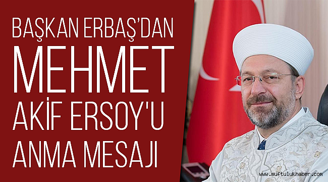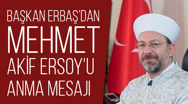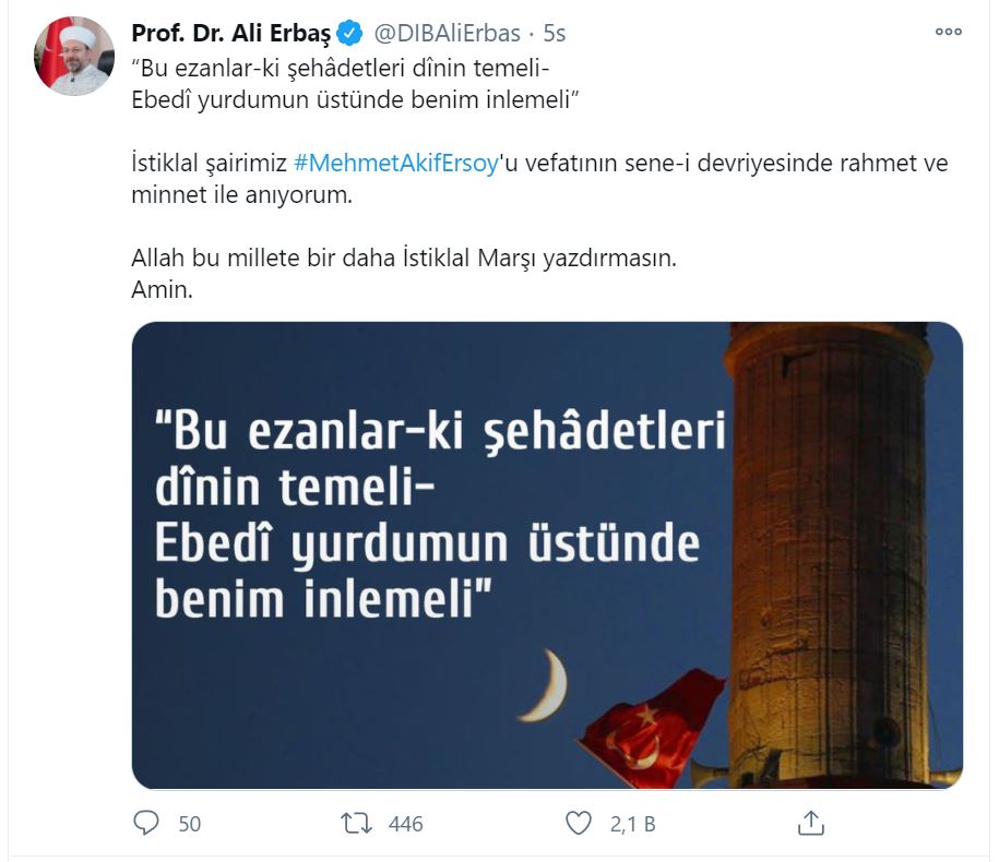 Diyanet İşleri Başkanı Prof. Dr. Ali Erbaş, Resmi Twitter. hesabında Mehmet Akif Ersoy'u anma mesajı yayınladı.