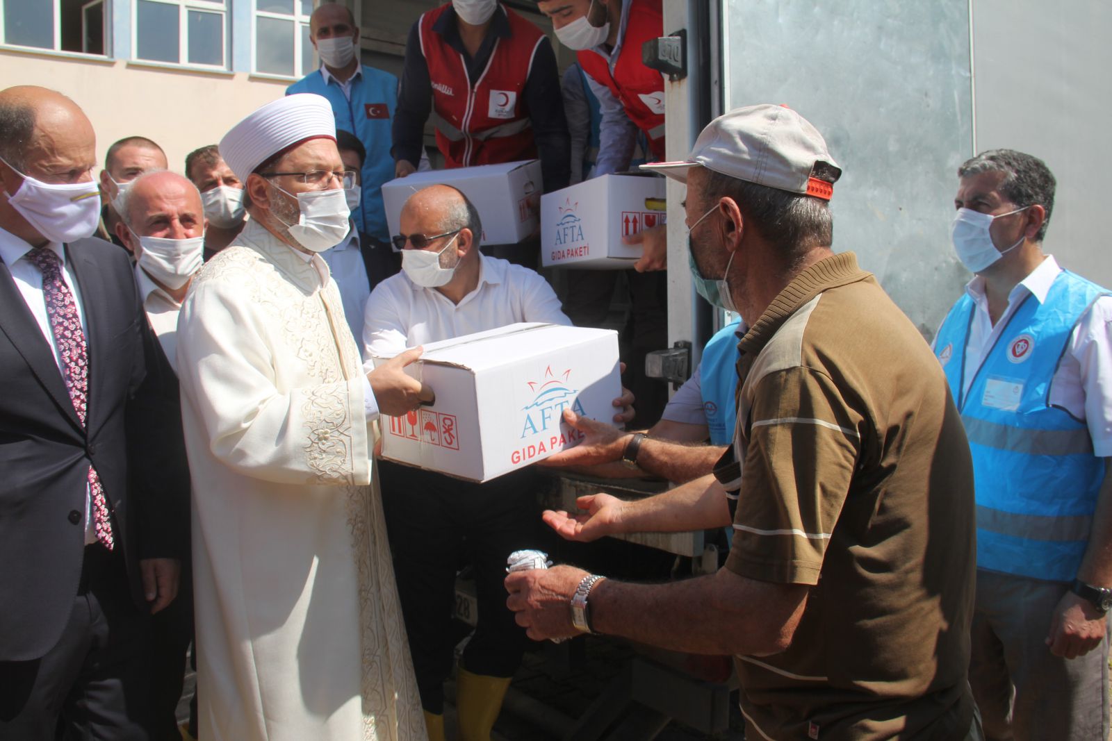 Diyanet İşleri Başkanı Prof. Dr. Ali Erbaş, selin büyük hasar oluşturduğu Giresun Dereli ilçe merkezindeki Şehit Tuncay Zengin Çok Programlı Anadolu Lisesinin bahçesinde, Türkiye diyanet Vakfı tarafından bölgeye gönderilen erzak kolilerinin dağıtımına katıldı.Dağıtım sonrası gazetecilere açıklamalarda bulunan Diyanet İşleri Başkanı Erbaş, sel nedeniyle kaybolan vatandaşların bir an önce bulunması niyazında bulundu.Başkan Erbaş, vefat eden vatandaşlara Allah'tan rahmet dileyerek, "Giresun'un çeşitli yerlerinde vefat eden kardeşlerimize Rabbim'den rahmet diliyorum. Dereli başta olmak üzere bölgede ilçelerimiz ve pek çok beldemiz zarar gördü. Allah kolaylık versin"dedi."Zarara uğrayan kardeşlerimizin yardımı için devletimiz burada bakanlarımız burada." diyen Başkan Erbaş, şunları kaydetti:"Birlik beraberlik içerisinde inşallah en kısa zamanda bu sıkıntıları devletimiz giderecektir. Biz de Türkiye diyanet vakfı olarak getirmiş olduğumuz kolilerimizi ihtiyaç sahibi kardeşlerimize veriyoruz. Türk Kızılay'ımız burada, pek çok yardım teşkilatı, sivil toplum kuruluşu burada. İşte bu, bizim milletimizin büyüklüğünü gösteriyor. Herhangi bir yerde afet olduğu zaman hemen devletimiz sivil toplum kuruluşlarımız, vakıflarımız, derneklerimiz orada milletimizin yardımına koşuyor.”