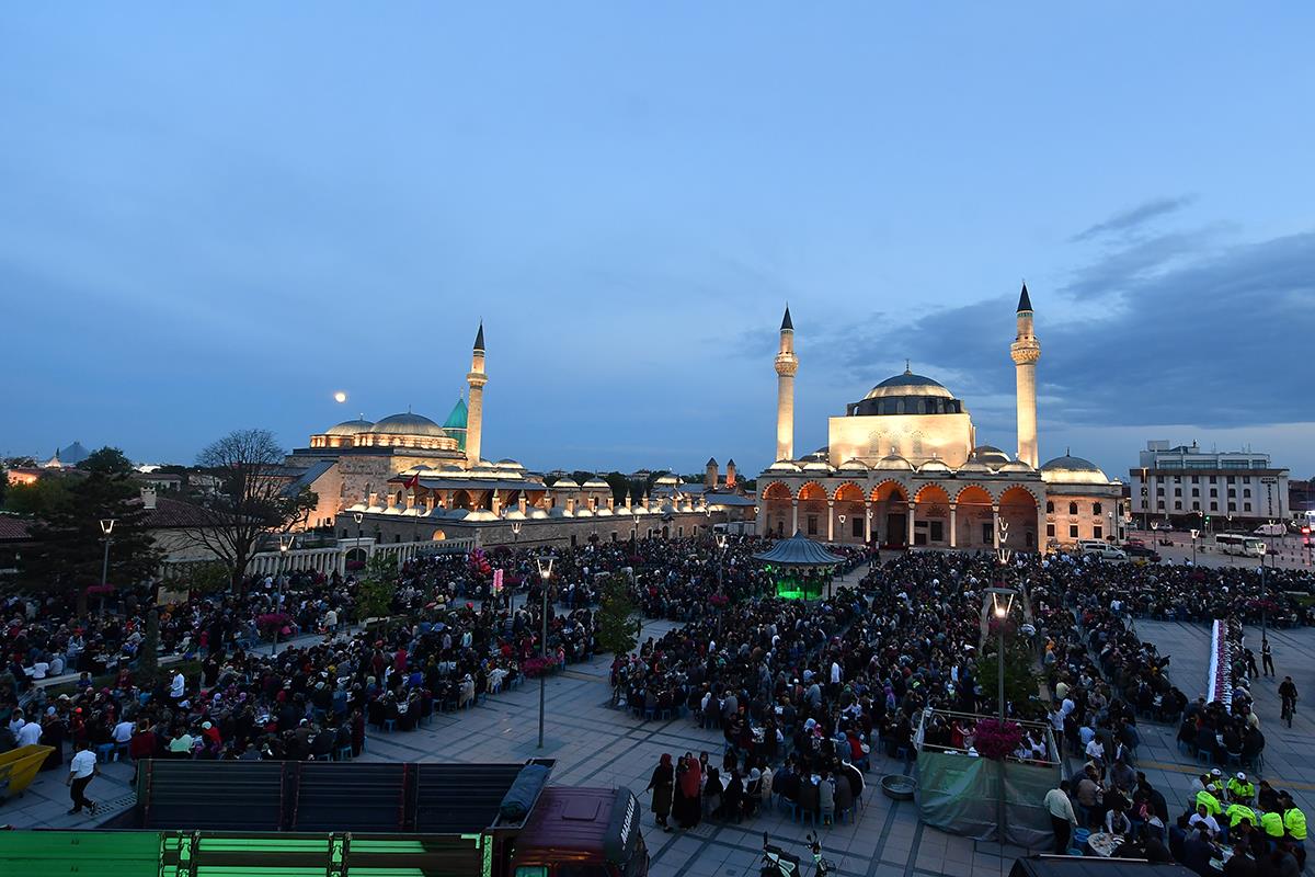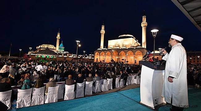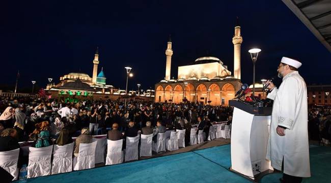 Diyanet İşleri Başkanı Prof. Dr. Ali Erbaş, Konya İl Müftülüğünün Mevlana Meydanı’nda düzenlediği iftar programına katıldı.Konyalı vatandaşların yoğun ilgi gösterdiği iftar programında konuşan diyanet İşleri Başkanı Erbaş, Konyalıların Ramazanını tebrik ederek, iftar sofrasında birlikte olmaktan duyduğu mutluluğu dile getirdi.Başkan Erbaş, Ramazan ayının paylaşım ve infak ayı olduğunu ifade ederek, “Bunun en büyük göstergesi sofralarımızı paylaştığımız, Mevlana Meydanı'ndaki bu manzaradır” dedi.Allah’ın Kur’an-ı Kerim'de iyilik ve takvada yardımlaşmayı, kötülük ve düşmanlıkta yardımlaşmamayı emrettiğini hatırlatan Başkan Erbaş, “Bizler neslimizi, çocuklarımızı bu ilkeler doğrultusunda yetiştirerek ideal bir toplum meydana getirmek zorundayız. Ailelerimizin her bir ferdinin gönlünde paylaşım, yardımlaşma ve infak anlayışını yerleştirmeliyiz” diye konuştu.Başkan Erbaş, Diyanet İşleri Başkanlığı olarak Ramazan ayı temasını infak olarak belirlediklerini belirterek, “Hocalarımız, bütün illerimizde, ilçelerimizde, yurtdışında bu meselenin ne kadar önemli olduğunu anlatıyorlar. Geçen yıl israf olmasın dedik, israftan insanlarımız uzaklaştırmaya çalıştık. Bu sene de infak ile paylaşma ruhunu geliştirmeye çalışıyoruz. Rabbim yapmış olduğumuz yardımları, hayır, hasenatı kabul eylesin” ifadelerini kullandı.