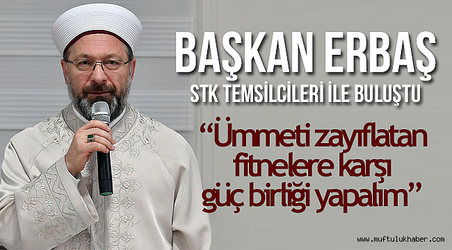 Başkan Erbaş, ırk, mezhep ve ideolojik kavgaların ümmeti zayıflatan fitneler olduğunu belirterek, şöyle devam etti:“Sivil toplum kuruluşlarımız, kanaat önderlerimiz, hepimiz ümmeti zayıflatan fitnelere karşı güç birliği yapalım. Yüreklerimizin toplu vurması gerekiyor. Çünkü davamız, inancımız, kıblemiz bir. Hangi ırktan, hangi renkten olursak olalım, ‘Müminler ancak kardeştir.’ Dünyanın neresinde yaşıyor olursa olsun müminler kardeştirler. Bizim ümmetin çocuklarına bırakacağımız en büyük emanet, fitne ve tefrikadan uzak olmalarıdır. Birlik ve beraberliktir. Allah’ın ipine sımsıkı sarılmaktır.”Diyanet İşleri Başkanlığının her zaman STK temsilcilerinin ve kanaat önderlerinin yanında olduğunu belirten Başkan Erbaş, “Ülke ve Müslümanlar olarak biz bir aileyiz” ifadelerini kullandı.Başkan Erbaş’ın konuşmasının ardından toplantıya katılan davetliler söz alarak duygu ve düşüncelerini ifade etti.Toplantıya, Diyarbakır Valisi Hasan Basri Güzeloğlu, Dicle Üniversitesi Rektörü Prof. Dr. Talip Gül, Diyanet İşleri Başkan Yardımcısı Dr. Burhan İşliyen, Eğitim Hizmetleri Genel Müdürü Kadir Dinç, Diyarbakır İl Müftüsü Yavuz Selim Karabayır ve çok sayıda STK temsilcisi ve kanaat önderi katıldı.