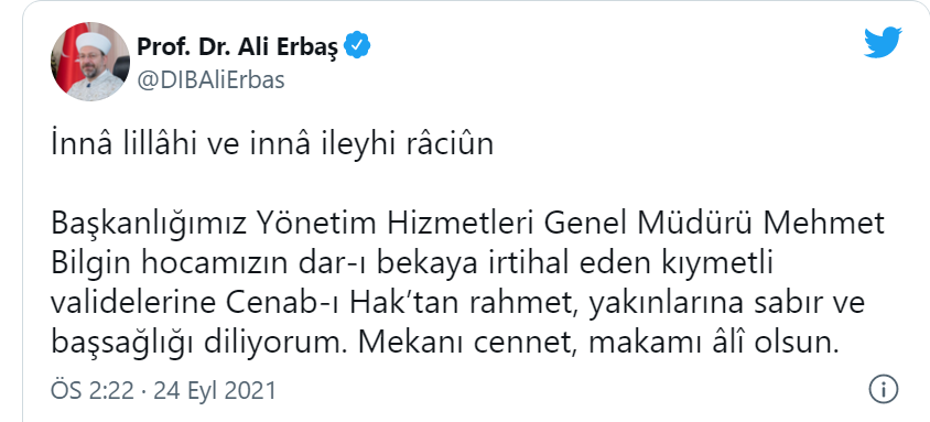 Diyanet İşleri Başkanı Prof. Dr. Ali Erbaş, Yönetim Hizmetleri Genel Müdürü Mehmet Bilgin'in vefat eden annesi için kişisel sosyal medya hesaplarından bir taziye mesajı yayınladı.