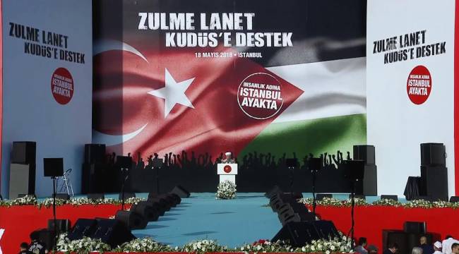 İsrail’in Gazze şeridinde Filistinlilere yönelik gerçekleştirdiği katliam nedeniyle Türkiye Gönüllü Teşekküller Vakfı öncülüğünde Filistin halkına destek için Yenikapı Etkinlik Alanı'nda "Zulme Lanet Kudüs'e Destek" mitingi düzenlendi.Cumhurbaşkanı Recep Tayyip Erdoğan, mitingde yaptığı konuşmada, "1 milyar 700 milyon Müslüman olarak Kudüs nöbetini devralma sırası bize gelmiştir" dedi.Kudüs’ün sadece bir şehir olmadığını ifade eden Erdoğan, “Kudüs bir semboldür. Bir imtihandır. Kudüs bir kıbledir. İlk kıblemizi koruyamazsak son kıblemize güvenle bakamayız. İslam dünyası Kudüs imtihanında sınıfta kalmıştır. Sadece İslam dünyası değil, tüm insanlık da sınıfta kalmıştır” diye konuştu.TBMM Başkanı KahramanTBMM Başkanı İsmail Kahraman da kürsüye çıktı ve şöyle seslendi: "Bu katliamı gerçekleştiren terörist İsrail'i en şiddetli şekilde lanetliyoruz. Müslüman ülkeler artık icraata geçmelidir."Başbakan YıldırımBaşbakan Binali Yıldırım ise konuşmasında “Filistin Türkiye'nin meselesidir. Milletimizin meselesidir. Bugün bu meydandan hep bir ağızdan tepkimizi ortaya koyuyoruz. Yaralı kardeşlerimizin yaralarını saracağız. Türkiye'ye yakışan budur. İnsanlık olarak bugün acımız birdir. Zulme rıza göstermek de zulümdür” ifadelerini kullandıDiyanet İşleri Başkanı ErbaşDiyanet İşleri Başkanı Prof. Dr. Ali Erbaş, mitingin sonunda dua yaparak, “Ya Rabbi, Kur’an-ı Kerim’de bize mübarek belde olarak tanıttığın peygamberler şehri Kudüs’e, zalim ve azgın güçler tarafından başlatılan hayâsızca bir işgal ve tecavüze karşı bu meydanda, huzurunda toplandık, milletçe ellerimizi açtık, sana yalvarıyoruz, dualarımızı kabul eyle Allah’ım!” niyazında bulundu.100 binlerce Kudüs sevdalısının ‘amin’ diyerek eşlik ettiği duada Başkan Erbaş şöyle dua etti;Ya Rabbi, Kur’an-ı Kerim’de bize mübarek belde olarak tanıttığın peygamberler şehri Kudüs’e, zalim ve azgın güçler tarafından başlatılan hayâsızca bir işgal ve tecavüze karşı bu meydanda, huzurunda toplandık, milletçe ellerimizi açtık, sana yalvarıyoruz, dualarımızı kabul eyle Allah’ım!Ey hayatın ve ölümün sahibi olan ve şehadeti bizlere en kutlu ideal olarak tanıtan Rabbimiz! Miracın şehri Kudüs uğruna canını feda eden bütün şehitlerimize rahmet eyle, ruhlarını şad eyle, başta Sevgili Peygamberimiz (sas) olmak üzere Bedir ve Uhud şehitleri ile birlikte Hz. Aliyyü’l Murtaza, Seyyid-ü şüheda Hz. Hüseyin Efendimiz ile beraber haşrolmayı, cennet ve cemalinle müşerref olmayı nasip eyle Allah’ım!Allah’ım, hani Bedir’de Peygamber Efendimiz; “Ya rabbi, İslam’ın bu ordusuna yardım eyle. Sana iman eden bir avuç mücahidi muzaffer eyle” diye dua etmişti de; ayet-i kerime ile binlerce melekle yardım ettiğini müjdelemiştin. Yarabbi şu anda yine, Gazze’nin, Kudüs’ün mazlum mücahitleri başta olmak üzere, âlem-i İslam’ın her köşesinde hak, hakikat ve mukaddesat için mücadele edenlere Bedir’de yaptığın gibi meleklerinde yardım eyle, nusretini göster, kudretinle şerefyab eyle Allah’ım. Ya Rabbi, Kur’an-ı Kerim’de bize öğrettiğin dua ile sana niyaz ediyoruz.Bu azgın ve zalim topluluğa karşı bizlere, Filistinli kardeşlerimize yardım eyle ya Rabbi.Ya Rabbi sana iman eden kullarının izzetini, şerefini, onurunu, harimi ismetini hiçbir zalim, zorba, işgalci güce çiğnetme Allahım!Milletimizin ve bütün Müslümanların bekasını sarsacak her türlü dâhili ve harici fitne ve fesada, hile ve tuzağa karşı bizlere feraset ve basiret ihsan eyle Allahım.Dünyayı yaşanmaz hale getiren zalimlere, ümmetin birliğini, dirliğini bozmak isteyen hainlere karşı bizleri uyanık eyle, zalimler topluluğuna karşı bizlere yardım eyle Allah’ımBugün, Filistin başta olmak üzere yeryüzünün birçok yerinde zulme ve katliamlara maruz kalan, ülkeleri işgal edilen, camileri, değerleri harab edilen, hakları hukukları ihlal edilen bütün kardeşlerimize yardım eyle, bizi onlara yardımcı eyle, nusretinle inayetinle zaferler nasip eyle Allah’ımYüzyıllardır Din-i Mübin-i İslam’a hizmet etmiş, hep zalimin karşısında mazlumun yanında olmuş, kimsesizlerin, gariplerin, ezilenlerin, umudu olmuş aziz milletimize ve kahraman ordumuza rahmetinle, nusretinle muamele eyle, milletimizi ilelebet payidar eyle Allah’ımDin, iman, millet, hak, hakikat, adalet, erdem, fazilet uğruna mücadele etmeyi ve gerekirse bu yolda şehit olmayı en büyük paye sayan inancı; kalbimizden, neslimizden asil milletimizin yüreğinden ebediyyen eksik eyleme Allah’ım.Ey Yüce Rabbimiz! Sana inandık, sana güvendik, sana tevekkül ettik. Bizleri sensiz, sahipsiz, inayetsiz, kimsesiz, vatansız, çaresiz, bırakma Allah’ım!Mitinge ayrıca İslam İşbirliği Teşkilatı (İİT) Olağanüstü Zirvesi için İstanbul'da bulunan yabancı konuklar da katıldı.