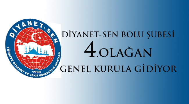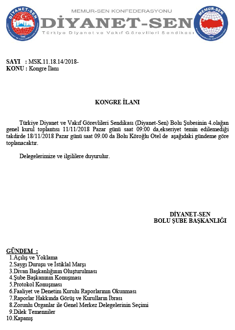 Türkiye Diyanet ve Vakıf Görevlileri Sendikası (Diyanet-Sen) Bolu Şubesinin 4.olağan genel kurul toplantısı 11/11/2018 Pazar günü saat 09:00 da,ekseriyet temin edilemediği takdirde 18/11/2018 Pazar günü saat 09.00 da Bolu Köroğlu Otel de aşağıdaki gündeme göre toplanacaktır.Delegelerimize ve ilgililere duyurulur.