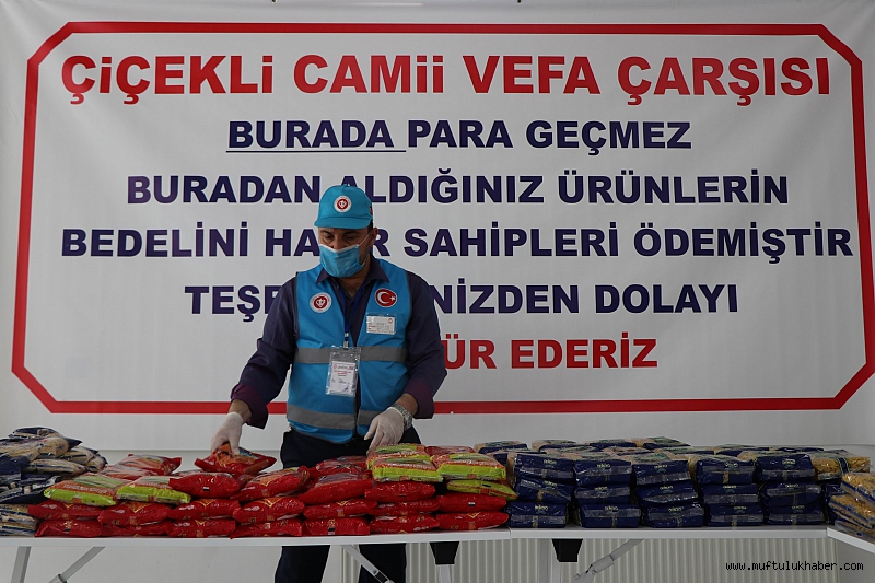 Cami İmamı Ahmet Aydemir tarafından Esentepe Mahallesinde 60 ailenin ihtiyaç sahibi olarak belirlenmesinin ardından ihtiyaç sahipleri camiye davet ediliyor. Caminin aşevi kısmına kurulan vefa çarşısına sosyal mesafe kurallarına göre alınan ihtiyaç sahipleri burada alışverişlerinin yapmasının ardından ayrılıyor. Çiçekli Cami İmam Hatibi Ahmet Aydemir yaptığı açıklamada, camilerin sadece bir ibadethane değil aynı zamanda derdine ortak olma yeri olduğunu biz ispatladıklarını söyledi. Aydemir, "Geçen sene Ramazan ayında burada her gün 300 kişiye iftar yemeği vermiştik.