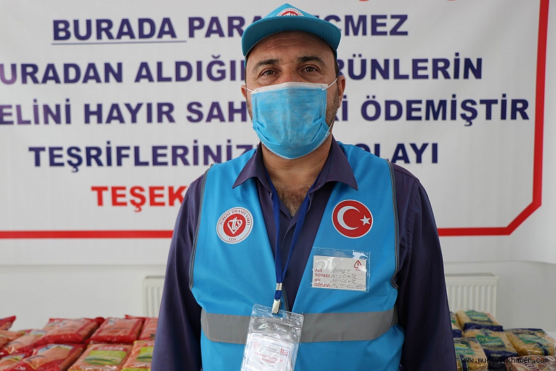 Hayır sahipleri her gün burada 300 kişiye yemek verdi. Bu senede dedik ki 300 kişi yemek yiyemeyeceğine göre farklı bir etkinlik yapalım istedik. Buraya hayır sahipleri gıda getirdiler. Bizde buraya bir vefa çarşısı kuralım ve bu vefa çarşısında isteyen gelsin istediği ihtiyacını alsın gitsin. Buradan çıkarken de dua etsinler istedik. Şuanda ihtiyaç sahipleri geliyorlar. Burada istediklerini alıyorlar. Giderken de biz ihtiyaç sahiplerine bir hediye takdim ediyoruz.