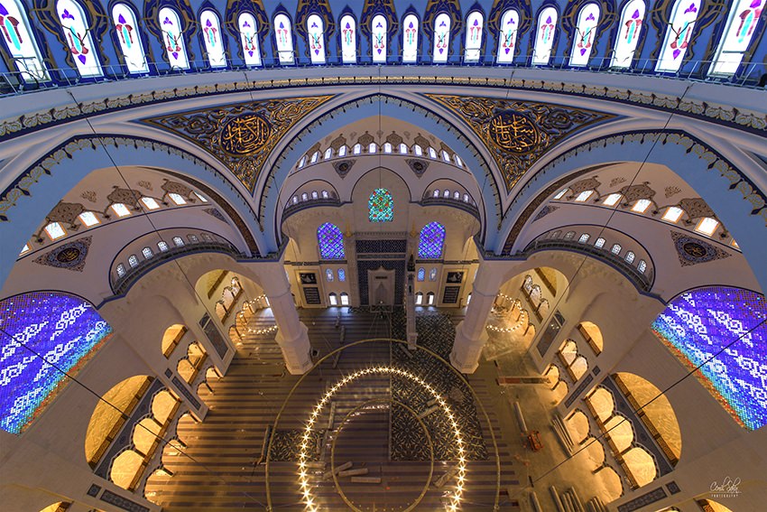 Caminin kubbe altındaki dört ayrı bölümde yer alan aslan göğüslerine, paslanmaz çelikten nanoteknolojiyle üretilen hatla Arapça "Ey ihtiyaçları gideren", "Dualara icabet eden", "Sesleri duyan", "Dualarımızı kabul et" sözleri yazıldı. Yine nanoteknoloji ürünü 220 metre boyunda ve yaklaşık 9 bin parçadan oluşan Fetih Suresi'nin tamamı, kubbe altındaki kemerlere monte edildi.
