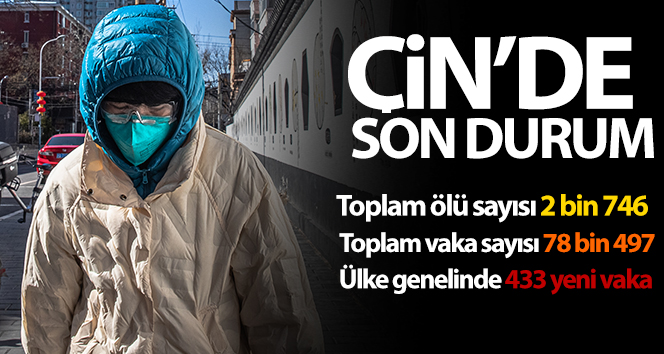 Çin'in Wuhan kentinde ortaya çıkan ve hızla yayılan korona virüsü nedeniyle ülkede hayatını kaybedenlerin sayısının 2 bin 746'ya ulaştığı bildirildi. Çin Ulusal Sağlık Komisyonu tarafından yapılan açıklamada, ülke genelinde 433 yeni vaka kaydedildiği, toplam vaka sayısının 78 bin 497'ye yükseldiği belirtildi. Hubei eyaleti dışındaki vaka sayısının ise 24'e yükseldiği kaydedildi.
