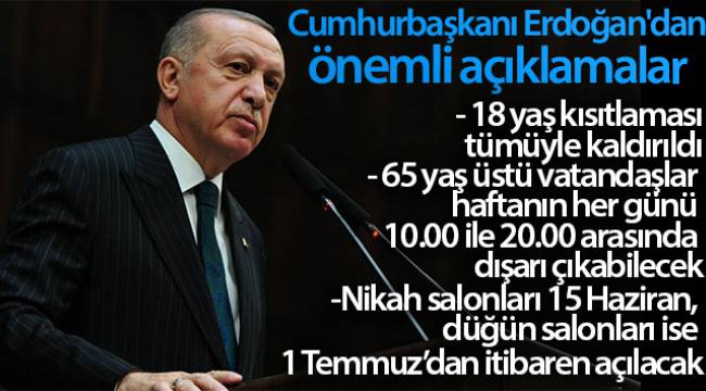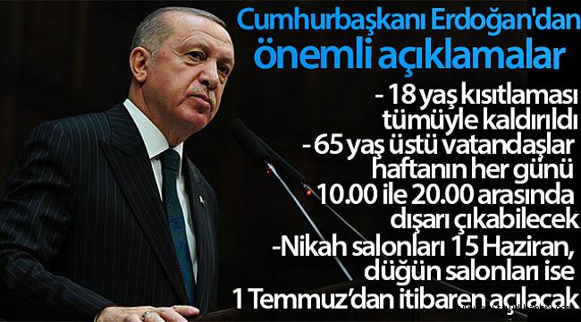 Cumhurbaşkanı Erdoğan'ın açıklamalarından satır başlıkları:- Nikah salonları 15 Haziran'dan, düğün salonları ise 1 Temmuz'dan itibaren belirlenen kurallara uygun şekilde hizmet vermeye başlayacaktır'- Cumhurbaşkanı Erdoğan: 'Yeni normal' dediğimiz düzenin bir süre daha devam edeceği gerçeğine kendimizi alıştırmalıyız- 18 yaş altı kısıtlama ebeveynleriyle birlikte olma şartıyla tümüyle kaldırıldı-Cumhurbaşkanı Erdoğan: 65 yaş üstü vatandaşlar haftanın her günü 10:00 ila 20:00 saatleri arası dışarı çıkabilecek -Lokanta ve kafelerin kapanış saati 24 olduÖnceki gün vefat eden, vefat yıldönümlerinde özlemle yadettiğimiz Abdurrahim Karakoç ve Cahit Zarifoğlu'na bir kez daha Allah'tan rahmet dileyerek başlamak istiyorum.Bu şahirlerimiz sadece kendi dönemlerini değil nesilleri etkisi altında bırakmış iki büyük gönül insanıdır.Müteffekkiri, sanatçısı, şairi, yazarı azalan millet kalbi ve damarları kurayan bir insan gibidir. Bir süre sonra yok oluşu kaçınılmazdır. Bu bakımdan medeniyetimizin sembolleri olan değerlerimize sahip çıkarken yeni değerler yetiştirmenin de çabası içinde olmalıyız.Uzun bir aradan sonra yüzyüze gerçekleştirdiğimiz kabine toplantımız az önce sona erdi.ATTIĞIMIZ ADIMLARI ÇOK YÖNLÜ DEĞERLENDİRDİKToplantımızda normalleşme takvimi çerçevesinde attığımız adımların çok yönlü değerlendirmesini yaptık. Özellikle Avrupa ile karşılaştırdığında en az kısıtlama, can kaybıyla atlattığımız bir gerçektir. Bu musibetin kökü tamamen kazınana kadar hayatımızı maske, mesafe, temizlik ilkeleri çerçevesinde düzenlememiz gerektiğini bir kez daha hatırlatmak istiyorum..