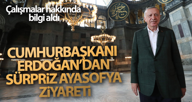 24 Temmuz'da ibadete açılacak Ayasofya Camii'nde incelemelerde bulunan Cumhurbaşkanı Erdoğan, yapılan hazırlıklar hakkında Bakan Ersoy ve diğer yetkililerden bilgi aldı. Yaklaşık bir saat incelemelerde bulunan Cumhurbaşkanı Erdoğan, daha sonra buradan ayrıldı. Vatandaşların yoğun ilgi gösterdiği Cumhurbaşkanı Erdoğan, camiden ayrılmadan önce de bir süre İçişleri Bakanı Süleyman Soylu ile görüştü.