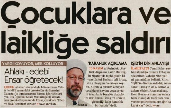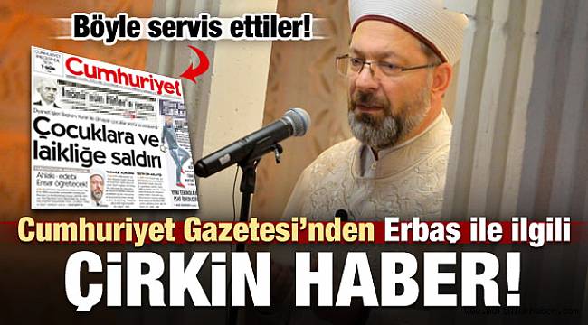 Diyanet İşleri Başkanı Prof. Dr. Ali Erbaş Mardin’de birtakım temaslarda bulundu. Dün sabah namazı için gittiği bir camide namazın ardından vatandaşlara seslenen Erbaş'ın, Kur'an ile olmayan çocukların şeytan veya şeytani insanlarla beraber olacağını belirterek ''Her nerede Kur-an'dan bahsedilirse, Kur'an-ı Kerim okunursa, orada bulunan insanların üzerine melekler kanatlarını gererler. Sürekli şekilde rahmet yağdırırlar. Tıpkı şimdi Rabbimizin rahmetinden, merhametinden istifade ettiğimiz gibi.'' şeklinde açıklamalarda bulundu. Cumhuriyet, Erbaş'ın dinin gereği olarak çocukların içki, uyuşturucu ve benzeri kötü alışkanlıklardan uzak tutmak için yapmış olduğu tavsiyeleri dine muhalif bir tavırla çarpıttı.''ÇOCUKLARA VE LAİKLİĞE SALDIRI'' MANŞETİYLE SERVİS ETTİLER!Cumhuriyet Gazetesi, Erbaş’ın açıklamalarını ''çocuklara ve laikliğe saldırı'' manşeti ile servis ederek din düşmanı tavrını bir kez daha ortaya koydu. Bununla da yetinmeyen Cumhuriyet gazetesi, Başkan Erbaş'ın Kadir Mısırıoğlu'na yapmış olduğu insani ziyareti de yeniden gündeme getirerek‘din anlayışını ortaya koydu’ diyerek ağır ithamlarda bulundu.