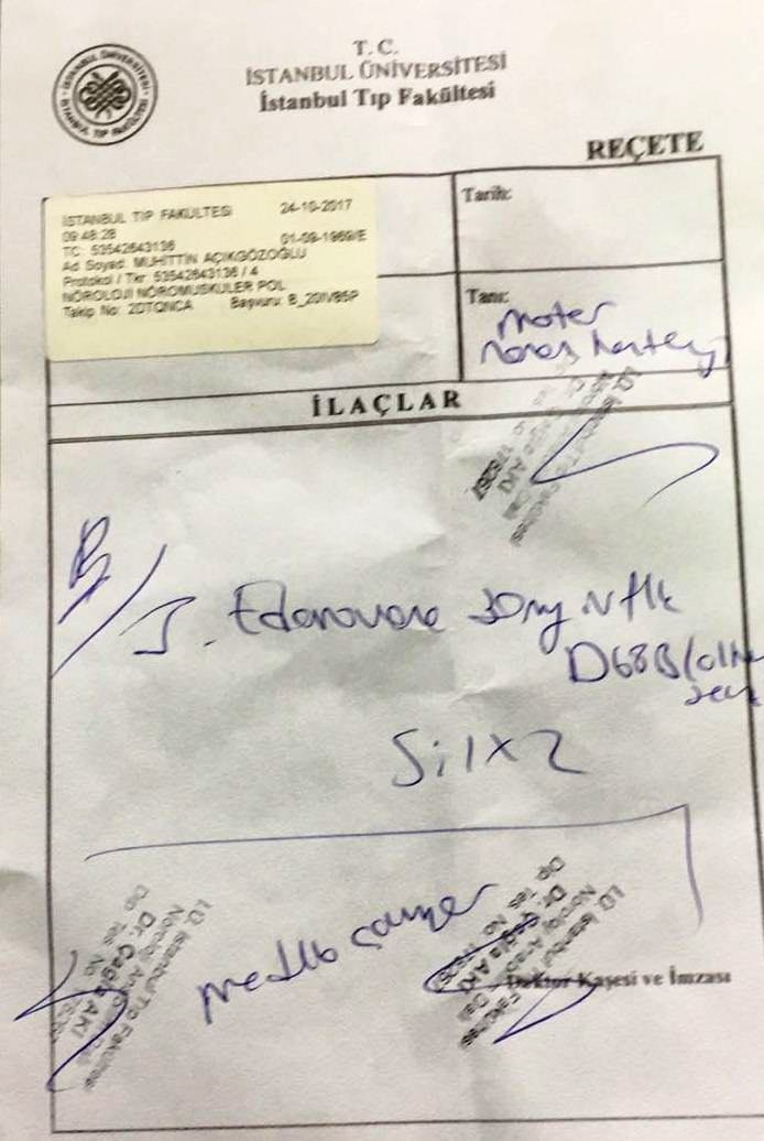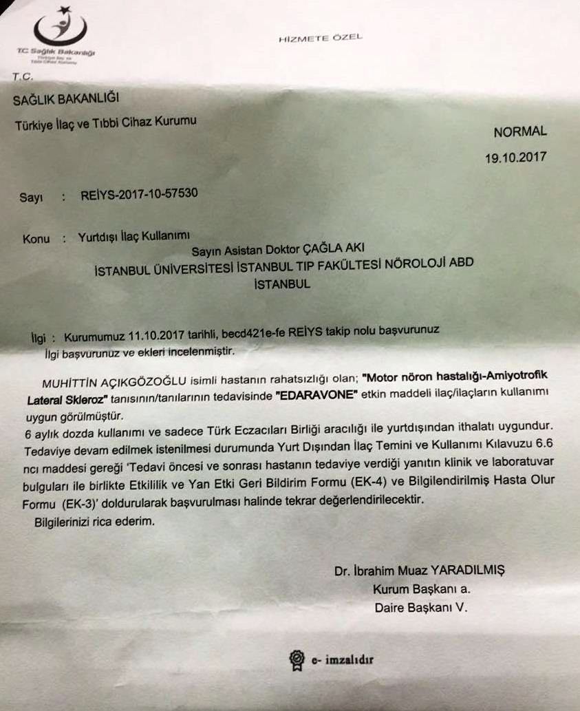 İSTANBUL ÜNİVERSİTESİ İSTANBUL TIP FAKÜLTESİ NÖROLOJİ VERDİĞİ RAPORDA DA;Muhittin Açıkgözoğlu isimli hastanın rahatsızlığı olan; “Motor nöron hastalığı-Amiyotrofik Lateral Skleroz" tanısının/tanılarının tedavisinde "EDARAVONE" etkin maddeli ilaç/ilaçların kullanımı uygun görülmüştür.