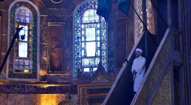 Ayasofya da, 86 yıl sonra ilk Kurban Bayramı hutbesini okuyan Diyanet İşleri Başkanı Prof. Dr. Ali Erbaş ın yine elinde kılıçla minbere çıkması dikkat çekti.Osmanlı dan kalan bu geleneğe göre cuma ve bayram hutbeleri için minbere kılıçla çıkan eski cami imamları, kılıcı sağ ele alırsa, “kullanma” niyetini ortaya koyuyor ve düşmanı korkutmayı amaçlıyor. Hutbelerde ise kılıç sol ele alınıyor. Bu da, dosta güven verme amacını taşıyor.FOTO:
