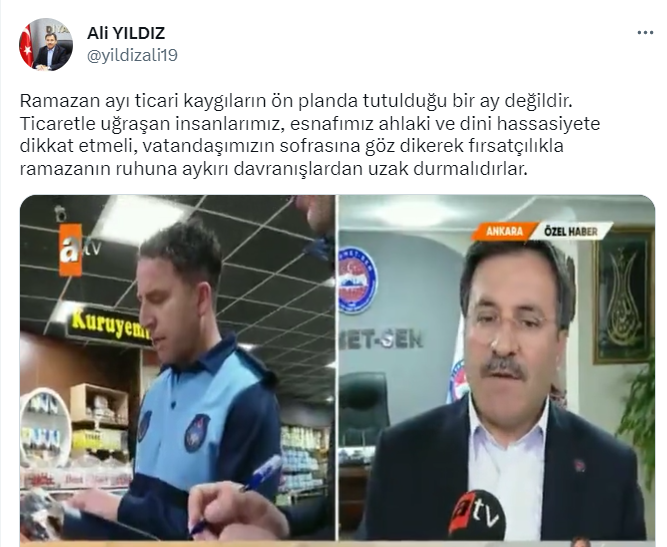 Ramazan ayı ticari kaygıların ön planda tutulduğu bir ay değildir. Ticaretle uğraşan insanlarımız, esnafımız ahlaki ve dini hassasiyete dikkat etmeli, vatandaşımızın sofrasına göz dikerek, fırsatçılıkla Ramazanın ruhuna aykırı davranışlardan uzak durmalıdır. Dedi.