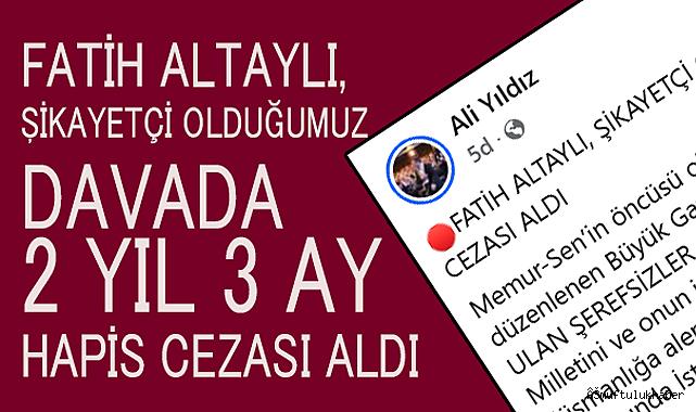 Diyanet Sen Genel Başkanı Ali YILDIZ Sosyal medya hesabından yaptığı paylaşımda , Gazeteci FATİH Altaylının Memur- Sen’in öncüsü olduğu Filistin platformu tarafından Ankara’da düzenlenen Büyük Gazze Yürüyüşüne katılanlar için yapmış olduğum hakaretten dolayı şikayetçi olduğumuz davada iki yıl üç ay hapis cezası aldığını söyledi