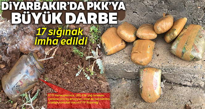 Diyarbakır’ın Silvan, Hazro, Lice ve Kulp ilçelerinde düzenlenen operasyonlarda PKK'lı teröristlerin kullandığı 17 sığınak imha edildi. Operasyonda toprağa tuzaklanmış patlayıcı, esrar maddesi ve çok sayıda mühimmat ele geçirildi.