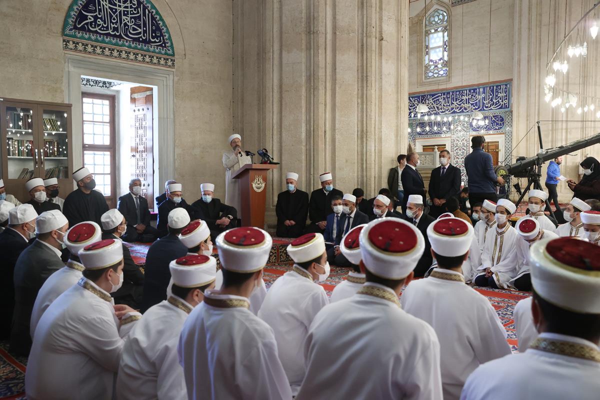 Diyanet İşleri Başkanı Prof. Dr. Ali Erbaş, Edirne’de katıldığı Camiler ve Din Görevlileri Haftası Açılış programının ardından, Selimiye Camii ‘inde düzenlenen hafızlık merasimine katıldı.Başkan Erbaş, burada yapmış olduğu konuşmada, Rabbimizin Kur’an-ı Kerim’de “Kur'an'ı biz indirdik onun muhafızı da biziz.” buyurduğunu hatırlatarak, “Bu ayet-i kerimede bir müjde var. Kur'an’ın indiği günden kıyamete kadar korunan bir kitap olduğunu, muhafaza edilen bir kitap olduğunu öğreniyoruz. Bugüne kadar bu mucize aynı şekilde devam etmiş ve kıyamete kadar da devam edecektir inşallah.” dedi.Yeryüzünde bir kula nasip olacak en büyük nimetlerden birisinin hafızlık olduğunu ifade eden Başkan Erbaş, “Gençlerimiz bu büyük nimet sizlere nasip oldu. Öyle büyük bir nimet ki yeryüzünde insanoğluna verilen her türlü unvandan daha büyük bir unvandır. Ne mutlu sizlere…” diye konuştu.