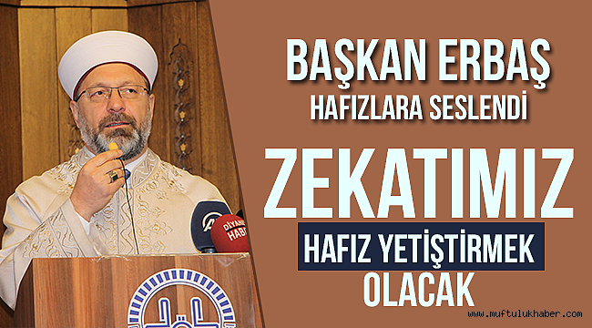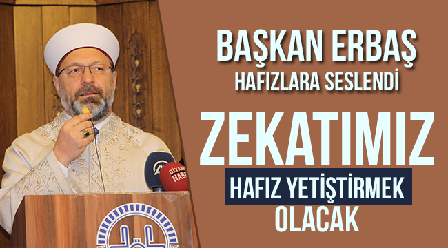 Başkan Erbaş sözlerinin devamında, “Hafızlarımız büyük bir gayret gösterdiler. Onların hocaları, anneleri, babaları, idarecileri en az kendileri kadar gayret ettiler. Arzu ettiler bu gençler hafız olsunlar diye. Oldular sonunda elhamdülillah. Cenabı hak mübarek eylesin. Hafızların hafızlığını mübarek eylesin. Hafızlarımızdan kendileri de hafız yetiştirmelerini istiyorum. Zekatımız hafız yetiştirmek olacak. Bunun sözünü istiyorum. Bugün ülkemizde 150 bin civarında hafızımız var. Her bir hafızımız bir hafız yetiştirse bir yılda 300 bin hafızımız olur. İnşallah bunu hafızlarımızdan bekliyorum” diye konuştu.