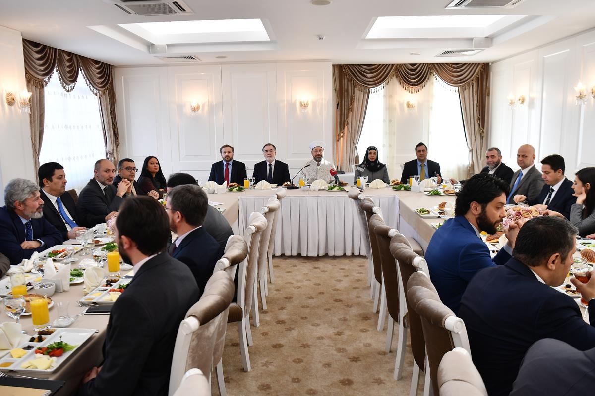 “Kur’an ve sünnet çizgisinde olanları destekleriz”Başkan Erbaş, FETÖ mensuplarının çeşitli sivil toplum kuruluşları ve cemaatler için ‘bizi bitirdiler sıra siz de’ diyerek fitne çıkarma gayretinde olduklarına dair yöneltilen soru üzerine, Diyanet’in her zaman faydalıyı faydasızdan ayırma noktasında çok hassas davrandığının altını çizerek şu cevabı verdi:“Biliyoruz ki pek çok kardeşimiz dini mübini İslam’ı Kur’an ve sünnet çizgisinden sapmadan anlatıyor. Biz onlara destek oluruz. Yeter ki o çizgiden sapmasın. Derdimiz o çizginin dışında olanları tespit etmek ve rehabilite edebileceğimiz varsa rehabilite etmek.”“Din İşleri Yüksek Kurulumuz dini görünümlü terör örgütleri üzerinde yeni çalışmalar yapıyor”Diyanet’in dini görünümlü terör örgütleri ile mücadelesine değinen Başkan Erbaş, “ DAEŞ ve FETÖ ile ilgili Din İşleri Yüksek Kurulumuz çok ciddi çalışmalar yaptı. Bu örgütün sağlıklı, sahih dini bir anlayışa sahip olmadığı kararı raporlaştırıldı. Din İşleri Yüksek Kurulumuz dini görünümlü terör örgütleri üzerinde yeni çalışmalar yapıyor. Sahih din anlayışını aşan farklı görüşleri olan ve milletimizin içine fitne sokmaya çalışan başka şahıslar, gruplar olabilir mi acaba diye bunun üzerinde çalışmalar yapıyoruz” açıklamasında bulundu.“Müftülerin nikah kıymaları hususunda hiçbir eksiğimiz kalmadı”Müftülerin kıyacakları nikahla ilgili son durumu paylaşan Başkan Erbaş,“Bundan iki ay kadar önce devletin ilgili kurumları nikâh konusuyla ilgili çalışmalarını tamamladılar. Bize düşen yanıyla ilgili bizde çalışmalarımızı tamamladık, genelgemizi hazırladık. Beş günlük eğitim de yaptık. Şu anda bu konuda herhangi bir eksiğimiz kalmadı” şeklinde konuştu.Camiler ihtiyaç doğrultusunda yapılacakBaşkan Erbaş, Diyanet İşleri Başkanlığının Çevre ve Şehircilik Bakanlığı ile birlikte yürüttüğü “Cami Standartları Projesi” hakkında bilgi vererek, “Türkiye’ de yıllık 600-700 civarında cami yapılıyor. Biz istiyoruz ki ihtiyaç olan yerlere yapılsın. Bundan sonra zaten ihtiyaç olmayan yerlere cami yapılması da zorlaşacak. Bu çalışmamız sonucunda eğer bir yerde camiye ihtiyaç yoksa orada cami yapılmayacak” ifadelerini kullandı.“Diyanet FETÖ benzeri birtakım yapılanmaların önündeki en büyük engeldir”Diyanet’in kaldırılması konusunun zaman zaman gündeme geldiğinin hatırlatılması üzerine Başkan Erbaş, FETÖ’nün ibret olması gerektiğini belirterek, şöyle konuştu:“FETÖ’nün ortaya çıkışında Diyanet İşleri Başkanlığı olmamış olsaydı belki de daha erken, daha kötü bir şekilde bizi meşgul edecek bir şey olabilirdi. FETÖ benzeri birtakım yapılanmaların önündeki en büyük engel Diyanet İşleri Başkanlığıdır.”“DAEŞ, Boko Haram, FETÖ gibi örgütlerin desteklenmesinin sebeplerinden birisi de İslamofobia’dır”İslamofobia konusuna da değinen Başkan Erbaş, “DAEŞ, Boko Haram, FETÖ, PKK gibi örgütlerin desteklenmesinin arka planında olanlardan birisi de İslamofobia’dır. Acaba insanlar İslam’dan nasıl uzaklaştırılabilir düşüncesi içerisinde yapılan birtakım çalışmalar var. Müslümanların bu konuda İslamofobia’nın altını besleyecek bir takım hal ve hareketlerden uzak durmaları gerekiyor. Bunun için Müslümanların daha iyi bir din eğitimine ihtiyaçları var, sağlıklı, sahih dini bilgiye ihtiyaçları var. Sahih dini bilgi ile donatılan bir Müslümanın İslamofobia’yı besleyen birtakım hal ve hareketlerden uzak duracağını biz her zaman söylüyoruz, bunun için hem din eğitiminin, hem gençlere verilen eğitimin bu noktada Kur’an ve sünnet ölçüsünün dışına çıkmaması gerekiyor” dedi.“DİTİB’e yönelik soruşturmaların tamamı kovuşturmaya gerek yoktur, şeklinde sonuçlandı”Almanya’da Diyanet İşleri Türk İslam Birliği’ne (DİTİB) yöneltilen soruyu üzerine Başkan Erbaş, “DİTİB’e yönelik soruşturmaların tamamı kovuşturmaya gerek yoktur, şeklinde sonuçlandı. 10 kadar imamımızla ilgili böyle bir durum söz konusuydu. Birkaçı Türkiye’ye çekilmişti ama şu anda o sorun tamamen ortadan kalktı” yanıtını verdi.“İslam her zaman kız çocuklarını eğitime yönlendirmiştir”Kız çocukları ile ilgili yapılan yanlış uygulamaların dinden kaynaklandığına dair yanlış bir algının olduğuna işaret eden Başkan Erbaş, şunları söyledi:“Zannediliyor ki kız çocuklarının küçük yaşta evliliğe zorlanması ya da kızlarla ilgili olumsuz olayların arka planında din var, İslam var. Bu tamamen yanlış bir düşüncedir. İslam her zaman kız çocuklarını eğitime yönlendirmiştir. Onlara sevgiyle yaklaşmaya yönlendirmiştir. Bunun arka planında cehalet, bilgisizlik vardır. Diyanet İşleri Başkanlığı olarak Aile ve Dini Rehberlik Daire Başkanlığımız yaptığı en önemli işlerden birisi budur. Kız çocuklarımızı, eğitimden mahrum bırakılan çocuklarımızı daha fazla okula gönderebilmek. 81 ilimizde ve büyük ilçelerimizde 350 noktada aile irşat bürolarımız var. Orada 350 kadar vaizemiz var. Tamamen aileyi kurtarma ve kız çocuklarını bu yanlış anlayışlardan uzaklaştırarak kurtarma noktasında gayret etmektedirler.”Toplantıya Diyanet İşleri Başkan Yardımcıları Osman Tıraşçı, Yrd. Doç. Dr. Selim Argun ve Prof. Dr. Huriye Martı da katıldı.