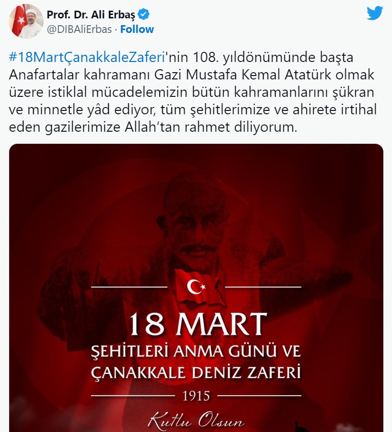 Diyanet İşleri Başkanı Prof. Dr. Ali Erbaş, ‘18 Mart Şehitleri Anma Günü ve Çanakkale Deniz Zaferi’ yıl dönümü dolayısıyla bir mesaj yayımladıBaşkan Erbaş, sosyal medya hesaplarından yayımladığı mesajında şu ifadelere yer verdi:“Çanakkale Zaferinin 108. yıl dönümünde başta Anafartalar kahramanı Gazi Mustafa Kemal Atatürk olmak üzere istiklal mücadelemizin bütün kahramanlarını şükran ve minnetle yad ediyor, tüm şehitlerimize ve ahirete irtihal eden gazilerimize Allah’tan rahmet diliyorum.”