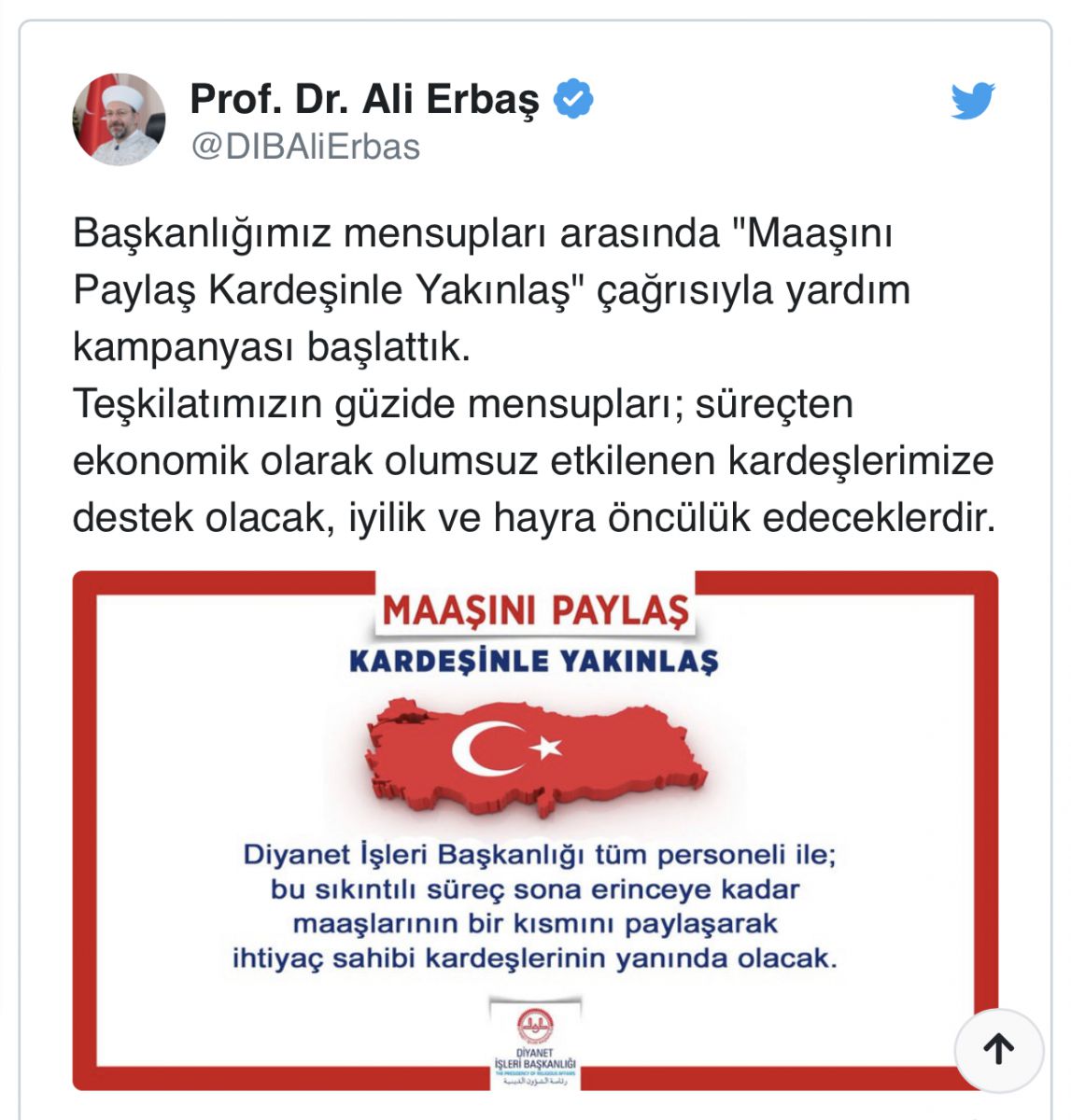Diyanet İşleri Başkanı Prof. Dr. Ali Erbaş, koronavirüs salgını karşısında mağdur olan vatandaşlar için Diyanet personeline bir çağrıda bulundu.