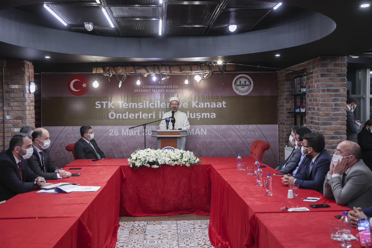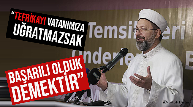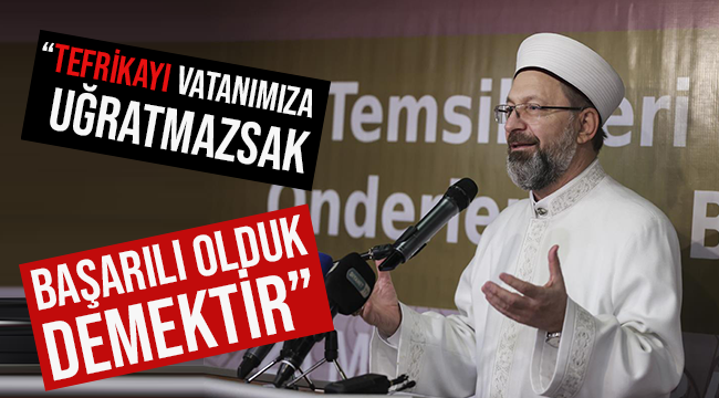Başkan Erbaş, insanlığın iyiliği için çalışmanın önemime değinerek, “Sivil Toplum Kuruluşları olarak hepimizin, milletimizin ve insanlığın hayrına olacak şekilde çalışmalar yapmamız önemli. Aksi halde kendi menfaatini öne çıkaran, kültür ve medeniyet değerlerimizi dikkate almayan bir yaklaşım, faydadan çok zarar verecektir.” diye konuştu.Kur’an-ı Kerim’de, “İyilik ve takvada yardımlaşınız, düşmanlık ve günahta yardımlaşmayınız” buyurulduğunu hatırlatan Başkan Erbaş, “İyilik ve erdem için bir araya gelenler, çok çalışıp güçlü olursa, fitne ve bozgunculuk için bir araya gelenler başarılı olamazlar. Yeter ki biz çok çalışalım, iyilik yolunda olanlar çok çalışsın.” ifadelerini kullandı.“Tefrikayı vatanımıza uğratmazsak başarılı olduk demektir”Başkan Erbaş, İslam dünyasını zayıflatan unsurların farkında olmak gerektiğinin altını çizerek, “Irk, mezhep, meşrep ideoloji kavgaları ve cehalet İslam coğrafyasını zayıflatan fitnelerdir. Kur’an şifadır, her derdimize devadır. Rabbimiz bizi uyarıyor, “Allah'a ve Resul'üne itaat edin ve birbirinizle çekişmeyiniz. Sonra korkuya kapılır dağılırsınız da gücünüz gider. Sabrediniz, Allah sabredenlerle beraberdir.”, “Hepiniz Allah’ın ipine sımsıkı sarılınız.” Akif, Allah kendisinden razı olsun, “Girmeden tefrika bir millete düşman giremez. Toplu vurdukça sineler onu top sindiremez.” diyor. Tefrikayı eğer beldemize, mahallemize, şehrimize, vatanımıza uğratmazsak başarılı olduk demektir.” şeklinde konuştu.“Ailemize sahip çıkalım”“Gençlerimizi kitapla buluşturmalıyız.” tavsiyesinde bulunan Başkan Erbaş, şunları söyledi:“Kitap cehaletin ortadan kalkması için en önemli unsur. Gençlerimizi ve çocuklarımıza milli ve manevi değerlerimizi en güzel bir şekilde ulaştırmaya çalışalım.”Ailenin önemine değinen Başkan Erbaş, “Aile olmazsa olmazımız. Kötülükte ve düşmanlıkta yardımlaşan insanlar var. Onların en önemli hedefi bizim ailemiz, aile değerlerimiz. Ailemize sahip çıkalım. Aile sağlam olursa toplum sağlam olur, toplum sağlam olursa millet sağlam olur.” değerlendirmesinde bulundu.Batman Valisi Hulusi Şahin ise konuşmasında Diyanet İşleri Başkanı Erbaş’ı Batman’da ağırlamaktan duyduğu memnuniyeti dile getirerek, katılımcılara teşekkür etti.Başkan Erbaş’ın konuşmasının ardından katılımcılar söz alarak duygu, düşüncelerini paylaştılar.Programda selamlama konuşması yapan Batman İl Müftüsü Turgut Erhan, Başkan Erbaş’a ve katılımcılara teşekkür etti.Programın sonunda Başkan Erbaş, Batman’da cami yaptıran hayırseverlere teşekkür belgesi verdi.Programa, Diyanet İşleri Başkanlığı Din Hizmetleri Genel Müdürü Bünyamin Albayrak, Yönetim Hizmetleri Genel Müdürü Mehmet Bilgin, İnsan Kaynakları Genel Müdürü Akif Pusmaz, Din İşleri Yüksek Kurulu Üyesi Mustafa Irmaklı ve STK temsilcileri ile kanaat önderleri katıldı.