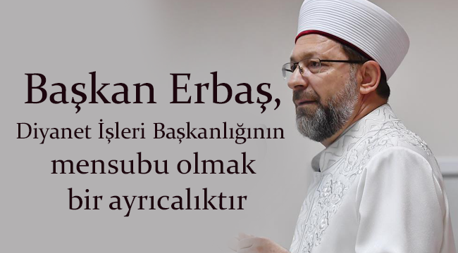 Başkan Erbaş, din görevlisinin rol modelliğinin önemini çocukluğunda yaşadığı bir anısı ile örnek vererek, “Köyümüze bir imam geldi. İmam Hatibi yeni bitirmiş, ilk tayin olduğu yer bizim köyümüz. Baki Hoca Allah selametlik versin, uzun ömürler versin. Köydeki bütün çocuklara önder oldu, örnek oldu. Herkes sordu, ‘siz nerede okudunuz’, ‘İmam Hatip'te okudum’, dedi. Tabii ona bakarak bizim gönlümüze bir imam hatip sevgisi düştü. Ortaokulu bitirdikten sonra başka bir yeri hiç düşünmedik. Onun gibi, o imam gibi olabilmek için İmam Hatip Okulunun yolunu tuttuk” diye konuştu.“Niyetimiz insanları kötülüklerden uzaklaştırmak”Din görevlisinin peygamberlerin varisleri olduğuna değinen Başkan Erbaş, “Peygamber Efendimiz hakkın batıla hakim olduğuna, galip olduğuna şahit oldu. Eliyle, diliyle, kalbiyle buna şahitlik yaptı. Bizim de şahit olmamız gerekiyor. Elimizle, dilimizle, kalbimizle, her şeyimizle iyiliklerin yayılmasına, kötülüklerin ortadan kalkmasına şahit olmalıyız” ifadelerini kullandı.“Bizim niyetimiz insanları kötülüklerden uzaklaştırmak. Onun için çalışacağız” diyen Başkan Erbaş, “Peygamberler böyle yaptı ve bu emaneti bizim üzerimizde bıraktı. Emanete riayet etmeliyiz. Bu bizim omuzlarımızda, bunu başkasına bırakamayız” şeklinde konuştu.“Mezhepçilik fitnesini aramıza sokmaya çalışıyorlar”Dünya üzerinde yaşanan mezhep savaşlarına dikkat çeken Başkan Erbaş, şöyle devam etti:“100 yıl önce ırkçılık fitnesini soktular bu milletin içine. Türkleri Araplara, Arapları Türklere kışkırtmak için böyle bir fitne soktular. Şimdi ırkçılığı da öteye geçtiler. Mezhepçilik fitnesini bizim aramıza sokmaya çalışıyorlar. Irkçılık fitnesinden vazgeçmediler. Halbuki bu milletin çocukları, Çanakkale'de Yemen'de ne diline ne de ırkına bakmadan omuz omuza sömürgecilerle savaştı.”