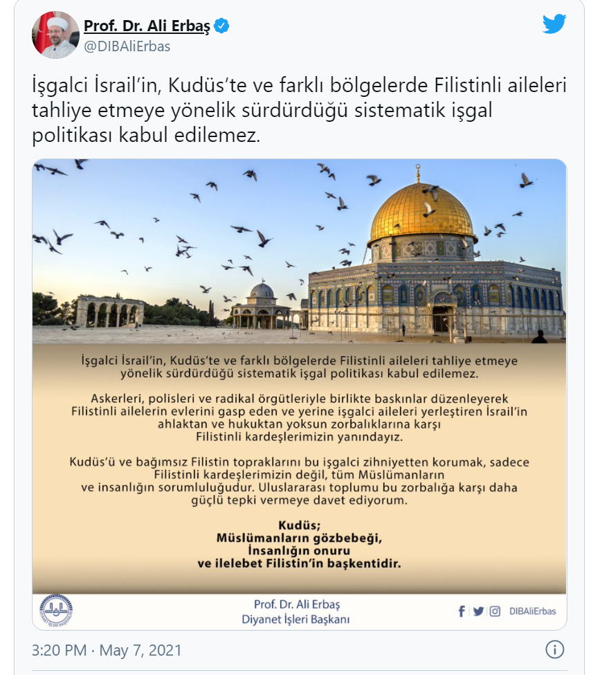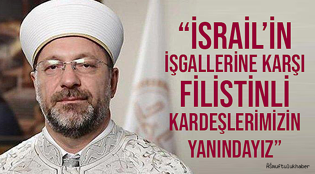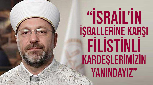 Diyanet İşleri Başkanı Prof. Dr. Ali Erbaş, İsrail’in Filistin’de sürdürdüğü işgal politikalarına tepki gösterdi.Diyanet İşleri Başkanı Erbaş, sosyal medya hesaplarından yaptığı açıklamada İsrail’in Filistinli ailelere yönelik yürüttüğü sistematik işgalin kabul edilemeyeceğini belirtti.İsrail’in Filistinli ailelerin gasp ettikleri evlerine işgalci aileleri yerleştirmesi karşısında Filistinli ailelerin yanında olduklarını ifade eden Başkan Erbaş’ın mesajı şu şekilde:“İşgalci İsrail’in, Kudüs’te ve farklı bölgelerde Filistinli aileleri tahliye etmeye yönelik sürdürdüğü sistematik işgal politikası kabul edilemez.Askerleri, polisleri ve radikal örgütleriyle birlikte baskınlar düzenleyerek Filistinli ailelerin evlerini gasp eden ve yerine işgalci aileleri yerleştiren İsrail’in ahlaktan ve hukuktan yoksun zorbalıklarına karşı Filistinli kardeşlerimizin yanındayız.Kudüs’ü ve bağımsız Filistin topraklarını bu işgalci zihniyetten korumak, sadece Filistinli kardeşlerimizin değil, tüm Müslümanların ve insanlığın sorumluluğudur. Uluslararası toplumu bu zorbalığa karşı daha güçlü tepki vermeye davet ediyorum.Kudüs; Müslümanların gözbebeği, insanlığın onuru ve ilelebet Filistin’in başkentidir.”