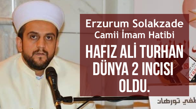 Erzurum Solakzade Camii İmam Hatibi Hafız Ali Turhan Tunus'ta yapılan Uluslararası Kur'an-ı Kerim Hafızlık, Güzel Okuma, Tefsir ve Tecvit Yarışması'nda Dünya 2'ncisi oldu.