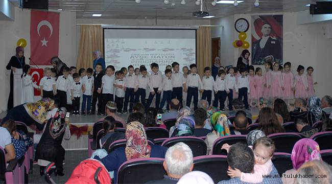 Giresun Müftülüğü 4-6 Yaş Kur’an kursları gelecek nesilleri Kur’an-ı Kerim’le buluşturuyor. Hayırseverlerin yardımlarıyla Kur’an kurslarının sayısı her geçen gün artıyor. Giresun Müftülüğü Ayşe Hatun 4-6 Yaş Yaz Kur’an Kursu’nu tamamlayan öğrenciler için yılsonu etkinliği düzenlendi. Kur’an Kursu öğreticileri Selma Çakır, Hicret Öztürk, Arzu Yayla ve Meryem Özdemir’in rehberliğinde öğrenciler ilahi ve piyes gösterileri gerçekleştirdiler.