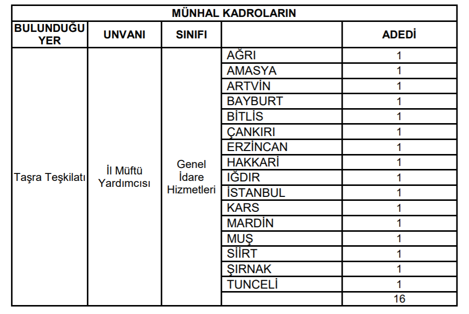 Diyanet İşleri Bayanlığımız Taşra Teşkilatında münhal bulunan; aşağıda yeri, sınıfı ve adedi belirtilen il müftü yardımcısı kadrolarına yazılı ve sözlü sınav sonucuna göre kurum içi naklen atama yapılacaktır.