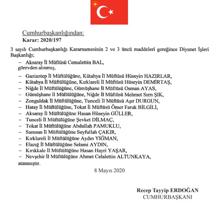 İl Müftüleri Kararnamesi Resmi Gazetede Yayımlandı.Aksaray İl Müftüsü Cemalettin BAL görevden alınırken,14 il Müftülüğüne atamalar yapıldıAksaray İl Müftüsü Cemalettin BAL,görevden alınmış,- Gaziantep İl Müftülüğüne, Kütahya İl Müftüsü Hüzeyin HAZIRLAR, - Kütahya İl Müftülüğüne, Kırklareli İl Müftüsü Hüseyin DEMİRTAŞ,- Niğde İl Müftülüğüne, Gümüşhane İl Müftüsü Osman AYAS,- Gümüşhane İl Müftülüğüne, Niğde İl Müftüsü Mehmet Sırrı ŞIK,- Zonguldak İl Müftülüğüne, Tunceli İl Müftüsü Aşır DURGUN,- Hatay İl Müftülüğüne, Tokat İl Müftüsü Ömer Faruk BİLGİLİ,- Aksaray İl Müftülüğüne Hasan Hüseyin GÜLLER,- Tunceli İl Müftülüğüne Şevket DİLMAÇ,- Tokat İl Müftülüğüne Abdullah PAMUKLU,- Samsun İl Müftülüğüne Seyfullah ÇAKIR,- Kırklareli il Müftülüğüne AydınYIĞMAN,- Elazığ İl Müftülüğüne Selami AYDIN,- Kırıkkale İl Müftülüğüne Hasan Hayri YAŞAR,- Nevşehir İl Müftülüğüne Ahmet Celalettin ALTUNKAYA,atanmıştır.