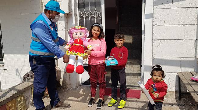 Nevşehir’de Merkez Çiçekli Camii’nde görev yapan İmam Hatip ve Türkiye diyanet Vakfı Gönüllüsü Ahmet Aydemir, korona virüs dolayısıyla camiye gidemeyen çocukları evlerinde ziyaret ederek onlara oyuncak hediye ediyor.